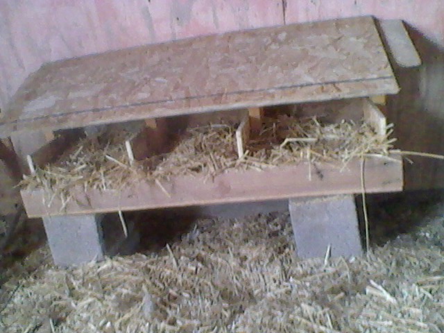 Through the use of a piece of OSB scrap D was going to PAY to throw away, I got the wider roof I needed to keep them from shitting in the nests. Then I stuffed the nests with straw, and hopefully the prospect of using these lovely nests will stimulate their maternal instincts or something. Or maybe I’ll just have to keep waiting. 🙂