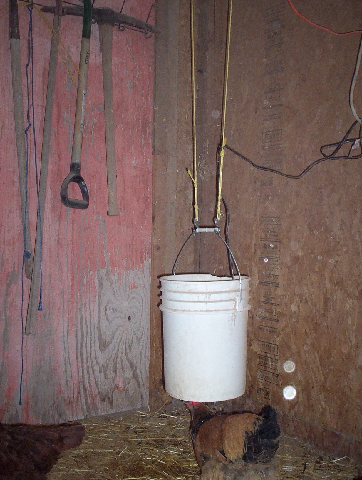 chick2Brought back some hardware from town on Friday, and yesterday I made some revisions to the watering pail so I can put more nipples in the bottom. The ladies do tend to queue up at the water. Had to move the bucket to the corner nearest the only electrical outlet so I could plug in the aquarium heater Landlady brought up last week. That works great, but standing the bucket on blocks means there can’t be more than two nipples in the bucket.