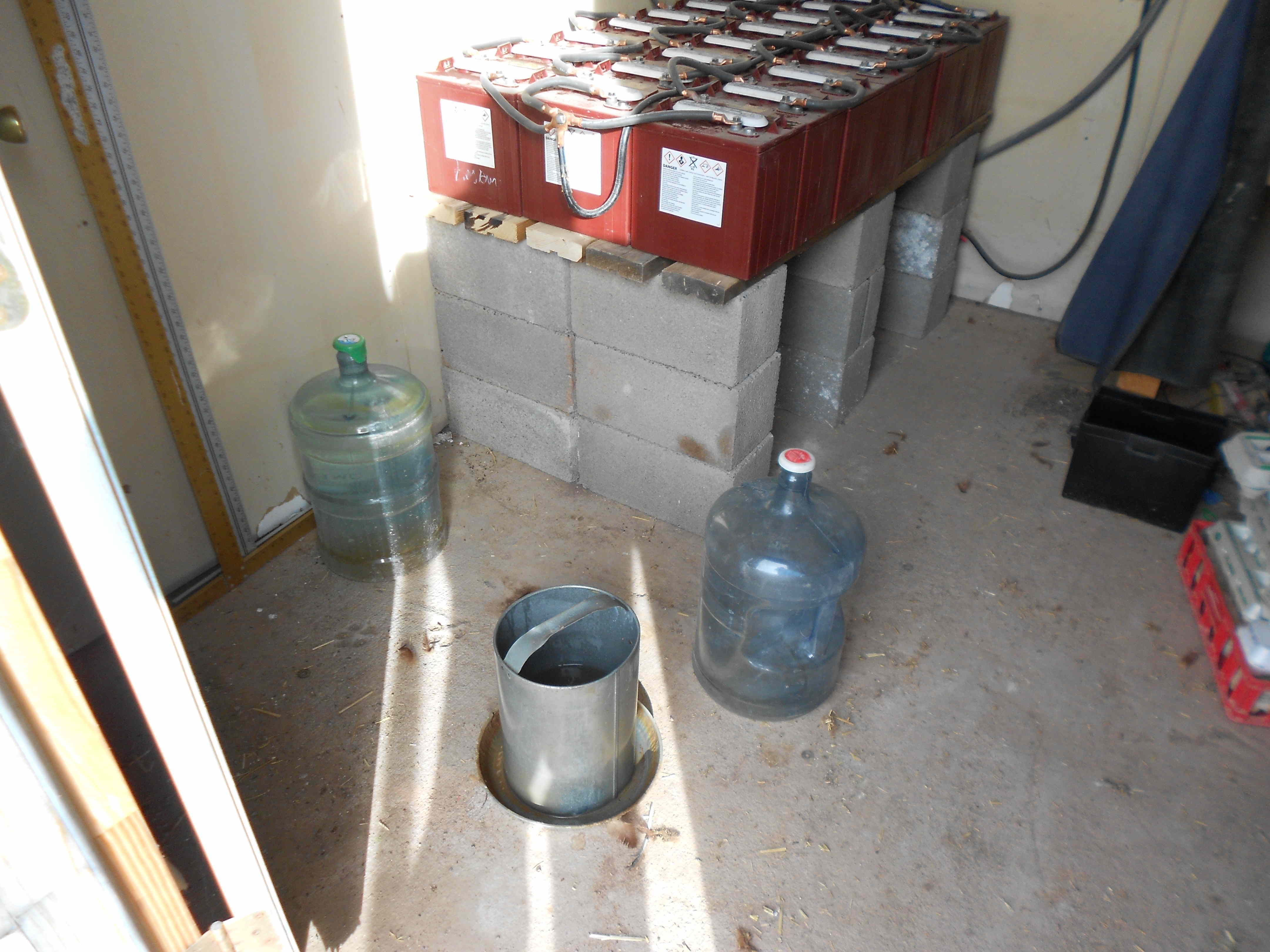 I keep their water in the powershed, which seldom goes below freezing because of the outgassing batteries. I have to haul their water from the Lair because there’s no water pressure up near the Big Chickenhouse. And filling water bottles normally needs to be done in the afternoon because of ice. Last night was overcast and the faucet probably didn’t freeze, but that was reason one for thinking I’ll need a second trip today.