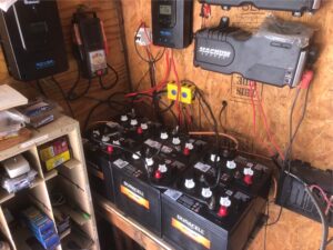 This morning I disconnected the four batteries I put there in 2019 and dragged them out to the yard, replacing them with the six batteries I bought yesterday. There was some fiddling in between: I needed a larger tabletop but I’d already cut that, and I needed to move the battery charger on the wall but that didn’t take long. Then I wired the batteries up and when the charge controllers came on line – I had 19 volts. Not 12. Not 24. 19. I needed 12. The inverter just gave me an error code. I had no power to the cabin except for DC. Which was 19 volts. This was not going to work.