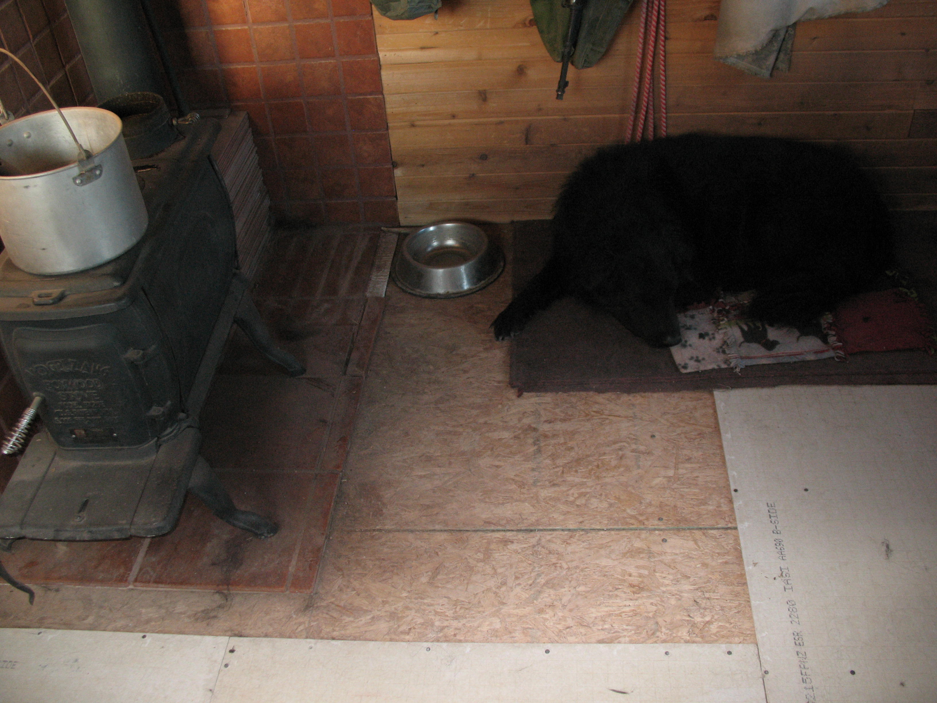 After I’ve convinced him to move his massive ass so I can do that – which is likely to be time-consuming because I’m running out of board so there’ll be some cutting and fitting of smaller pieces – then I need to move the woodstove and pull up the old tile from under it. The wall tiles can stay, but the floor tiles don’t match. That pad never fit the second stove very well anyway.