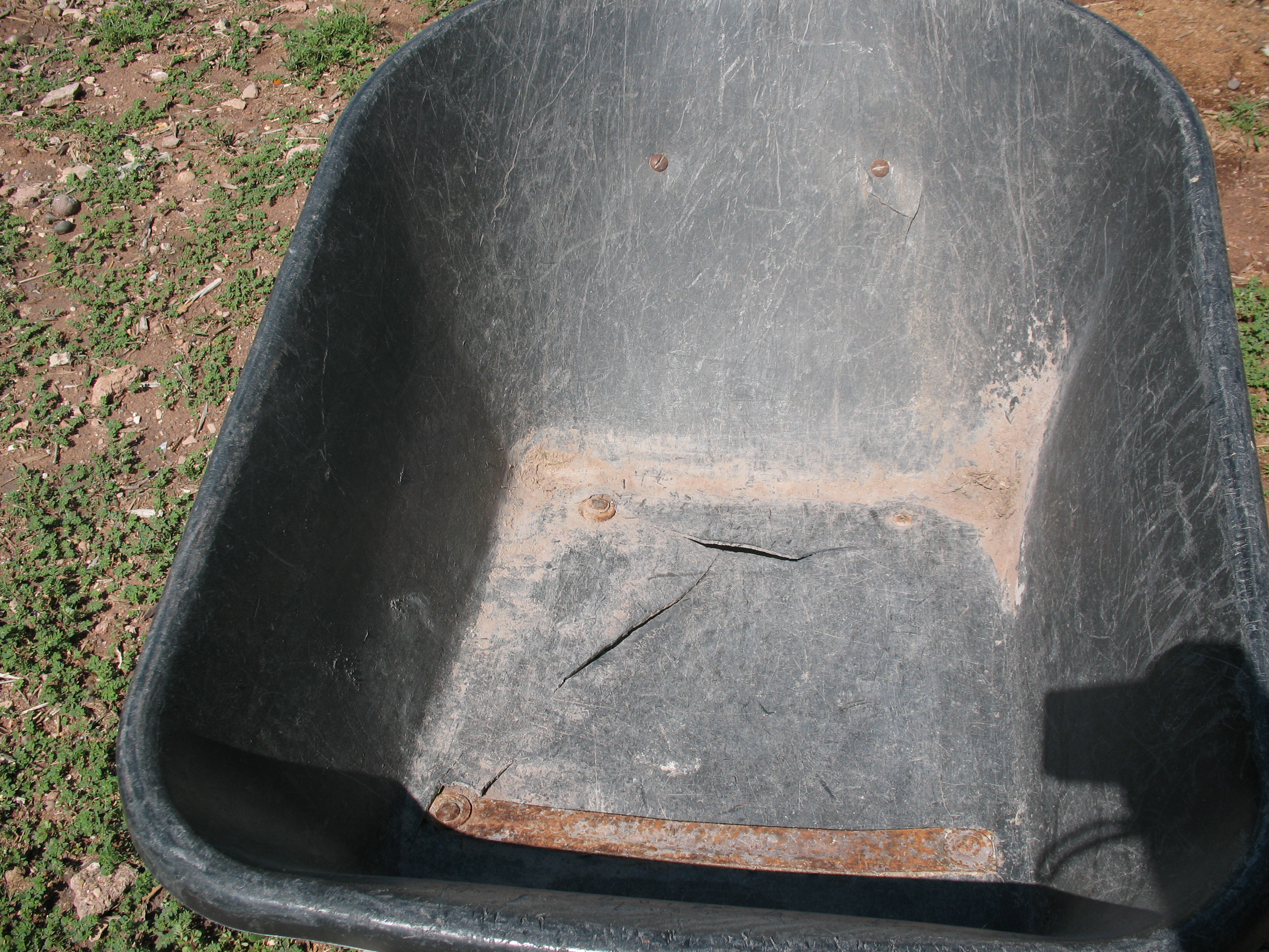 I’ve got a wheelbarrow that looks a lot like that – but in orange. ‘Rescued’ it from an abandoned property under foreclosure. I’ve been limping it along for several years now. First I tried Liquid Nails on it – worked for light duty for a year or so. Tried PVC cement a couple years ago and that failed a few months ago. I haven’t given up on it yet and keep calculating on how to repair it with what’s at hand here. I’d thought to experiment with a few short sections of 1″ by 2″ PVC trim – patching across the crack and secured with wood screws countersunk into the tub and into the trim pieces. I just haven’t found/made any extra time to take the tub off the frame to start the job.