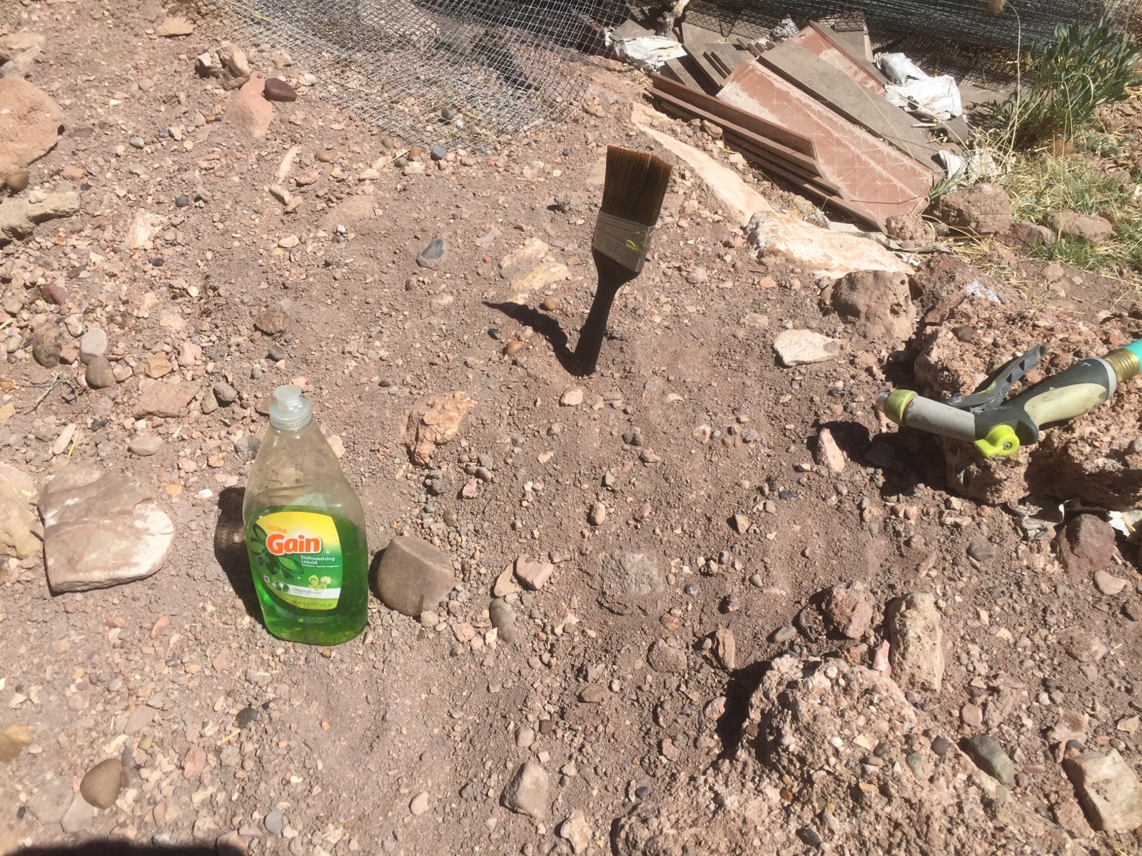 So this morning, coming back from chicken chores, we stopped in the wash and shoveled up a tub of nice clean sand. It’s starting to warm up, and so far the sand seems to be successfully killing the smell.