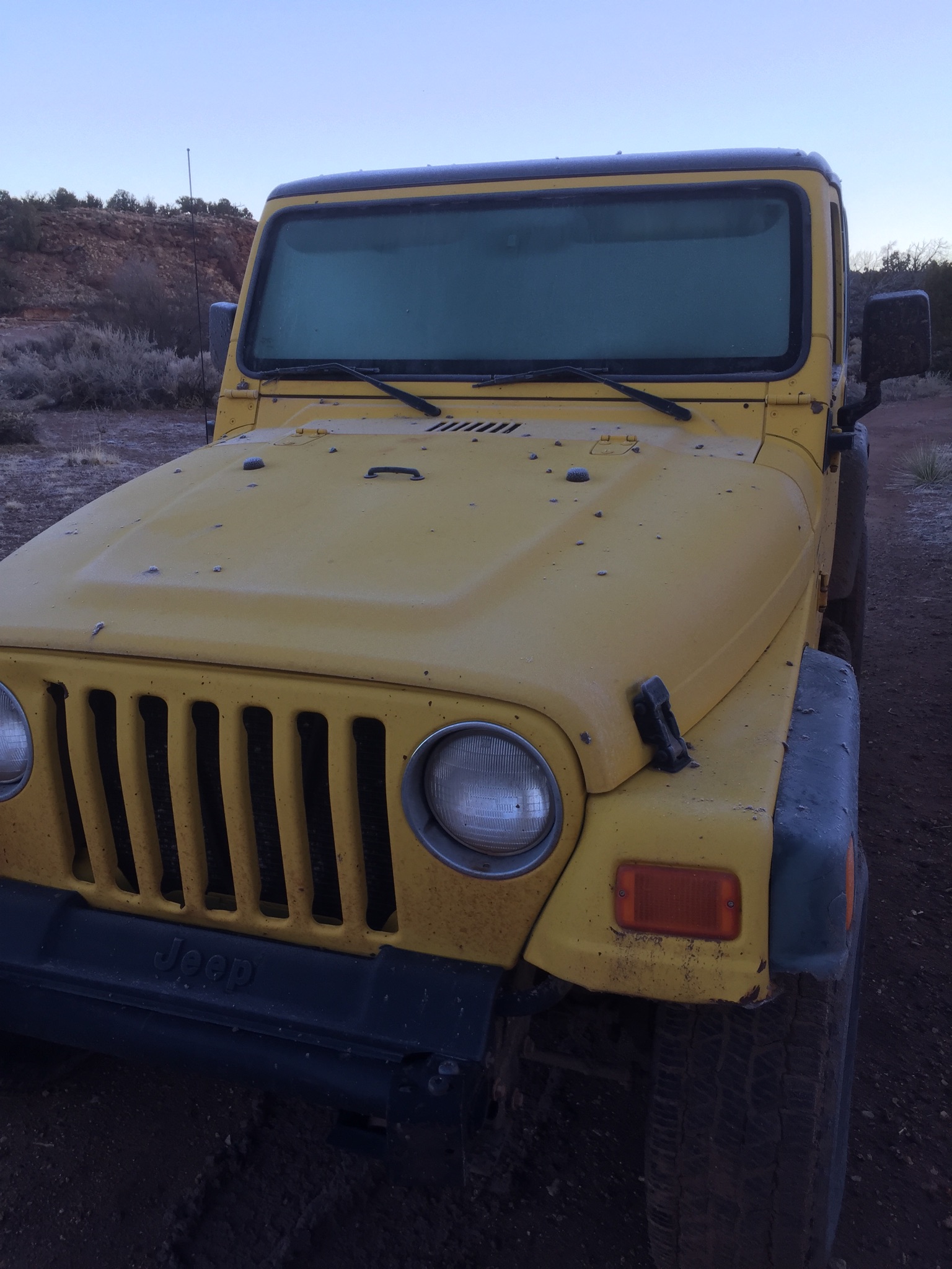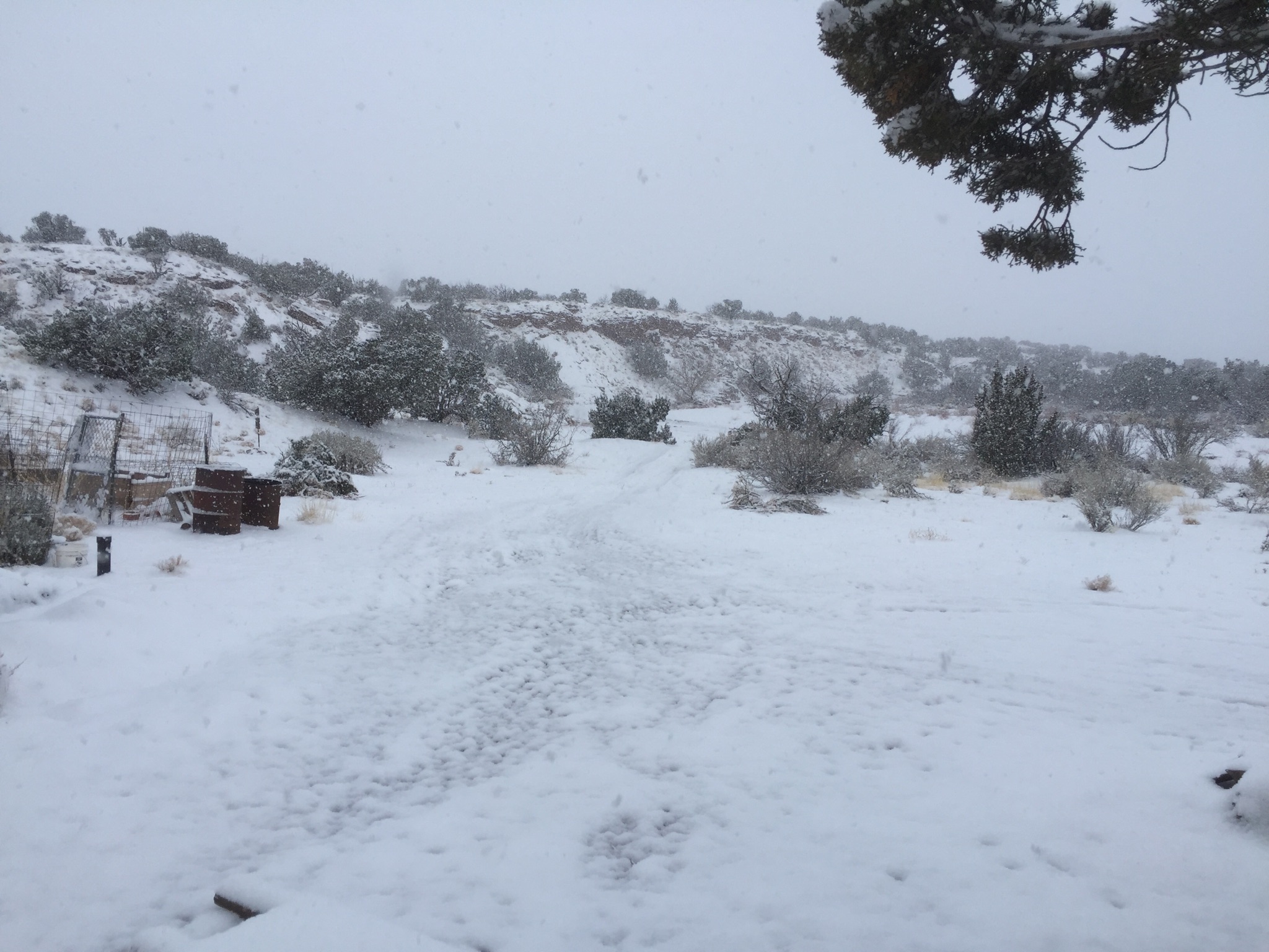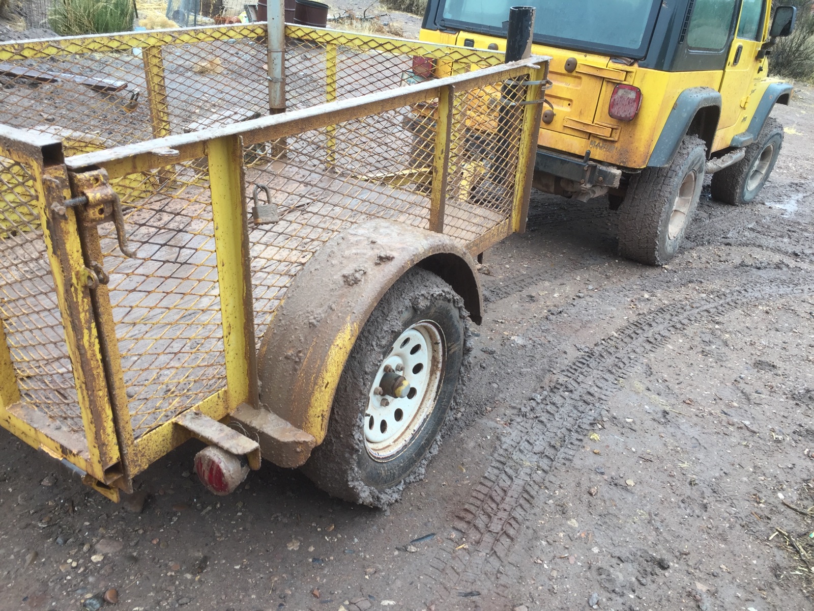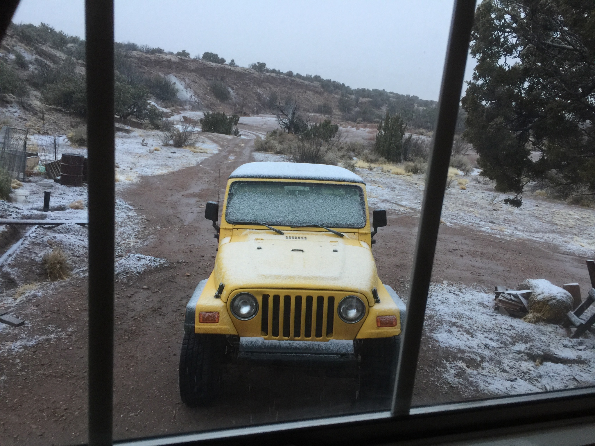 His wife had a doctor’s appointment they didn’t see fit to reschedule due to weather, and now she was in the truck and he was very slowly and moistly working his way back to his property to get his brother and another 4X4 to pick her up. I offered to help tow the truck, but he just wanted a ride home so he could get his brother. Shooed LB into the back of the Jeep, took my neighbor home, then went to Neighbor D’s through the wash which has much better traction as long as you’re not afraid it’ll flood. It’s been so dry so long that all this water was just dedicating itself to mud-making and nothing was running off yet.