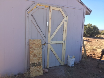 The gig mostly involves piles of stuff, which is my specialty. But the first thing he wanted was this shed door fixed. He also wanted the shed roof shingles fixed but I had to pass on that.