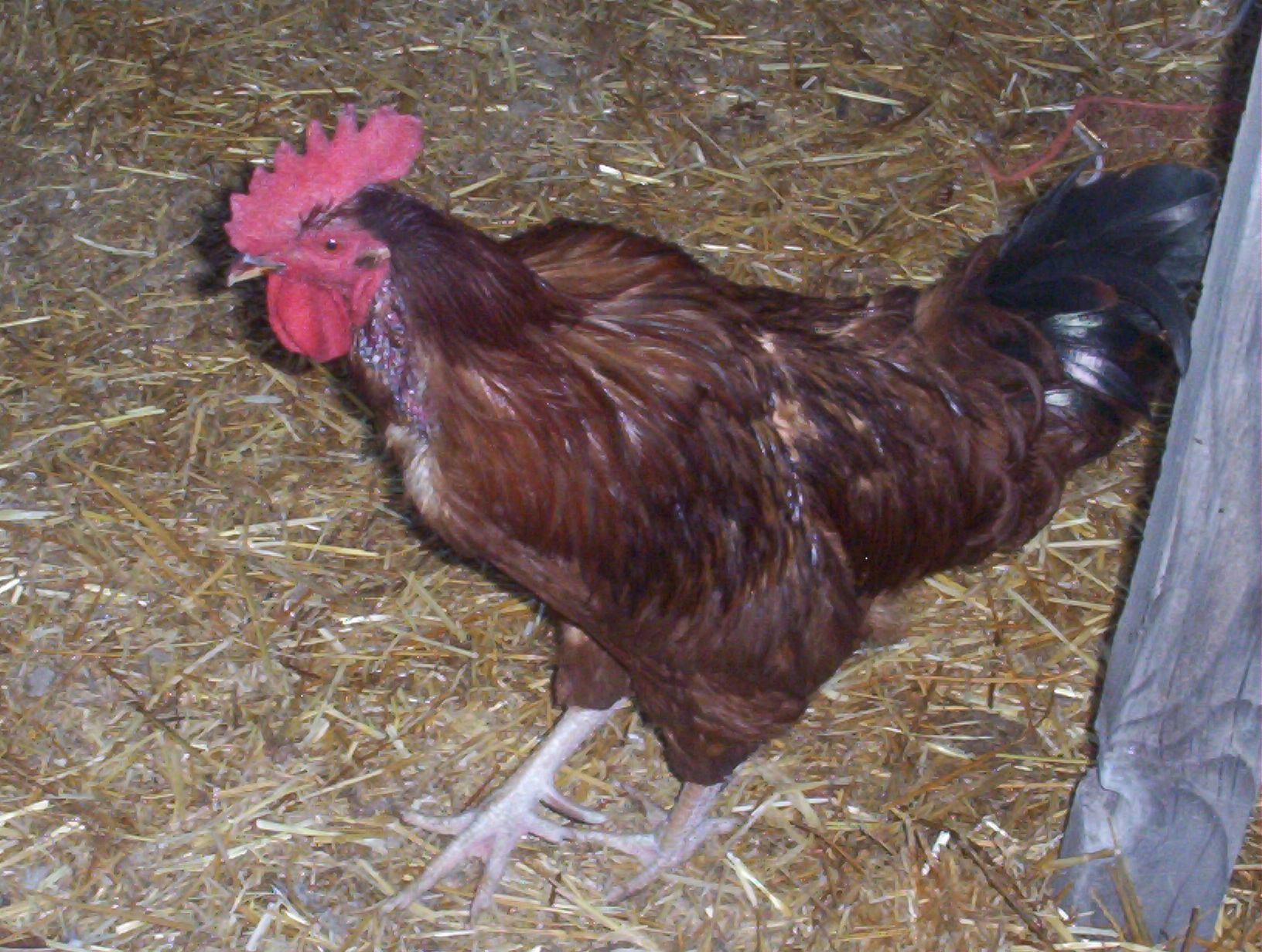 Seymour and his hens are molting right now, and not showing to best advantage. He’s normally a fine figure of a Rhode Island Red cock, and not this bedraggled.