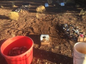 I filled that hole yesterday afternoon after spending an hour in the wash collecting stones for LB’s grave. Filled it with rocks and then smoothed it out with the displaced sand. Went past Boot Hill first thing this morning to see if anybody had dug themselves out overnight. Nope; apparently nobody was home yesterday…