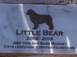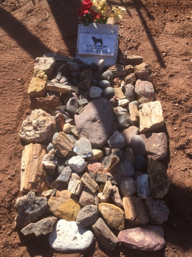 I confess I didn’t do the pretty rocks thing after I buried LB because that was never part of any plan I ever heard of. I did kind of start it, though: When we buried T we gave him a nice marker but it seemed kind of naked there on the bare dirt so I made a rectangle of stones from the wash to doll it up some. We started burying the pets in the same place; that was part of the original plan and then Landlady came up with the idea of the funny markers, which sort of played off T’s original marker…