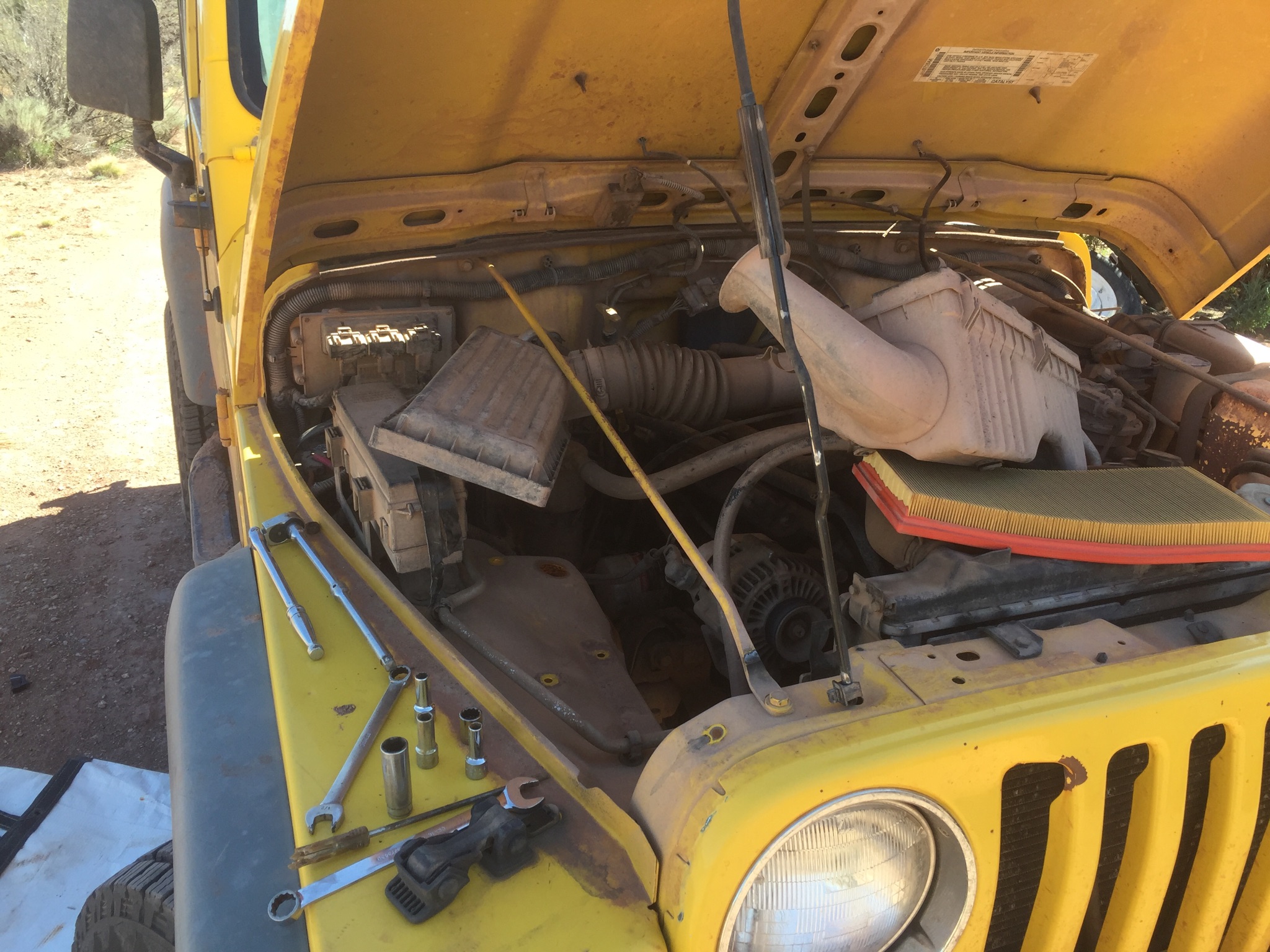 In the actual event, by Jeep-job standards it went very smoothly. Only one little thing went wrong: On the right side to get to the upper strut nut you need to remove the air filter box. I assumed that the nuts holding the three bolts that held the box in place were captive, because of course they were. Only a sadistic idiot would specify loose nuts in that application, way down over the front suspension.