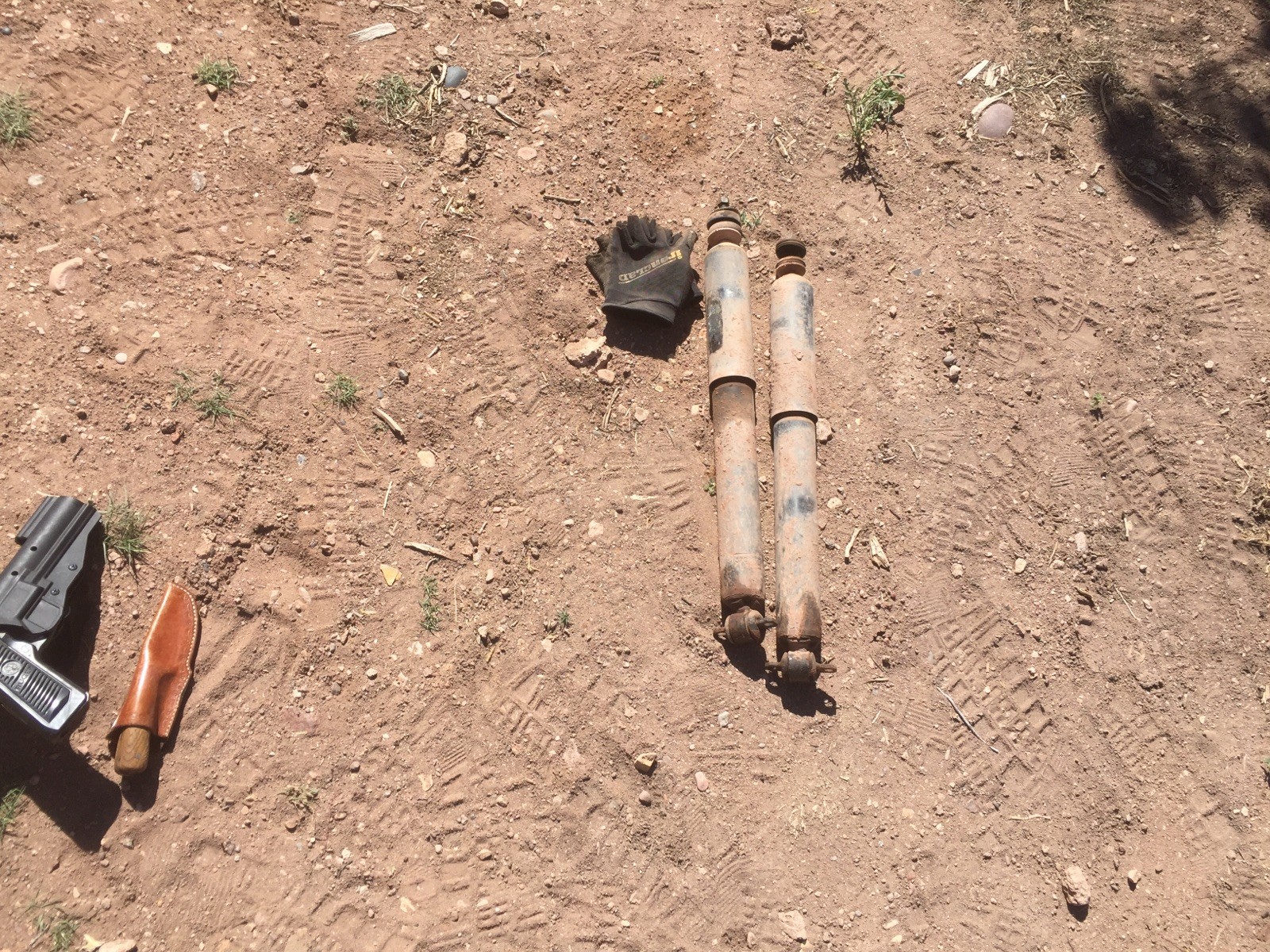 I hate front shocks, but I’ve never had to resort to a pistol and sheath knife in their replacement.