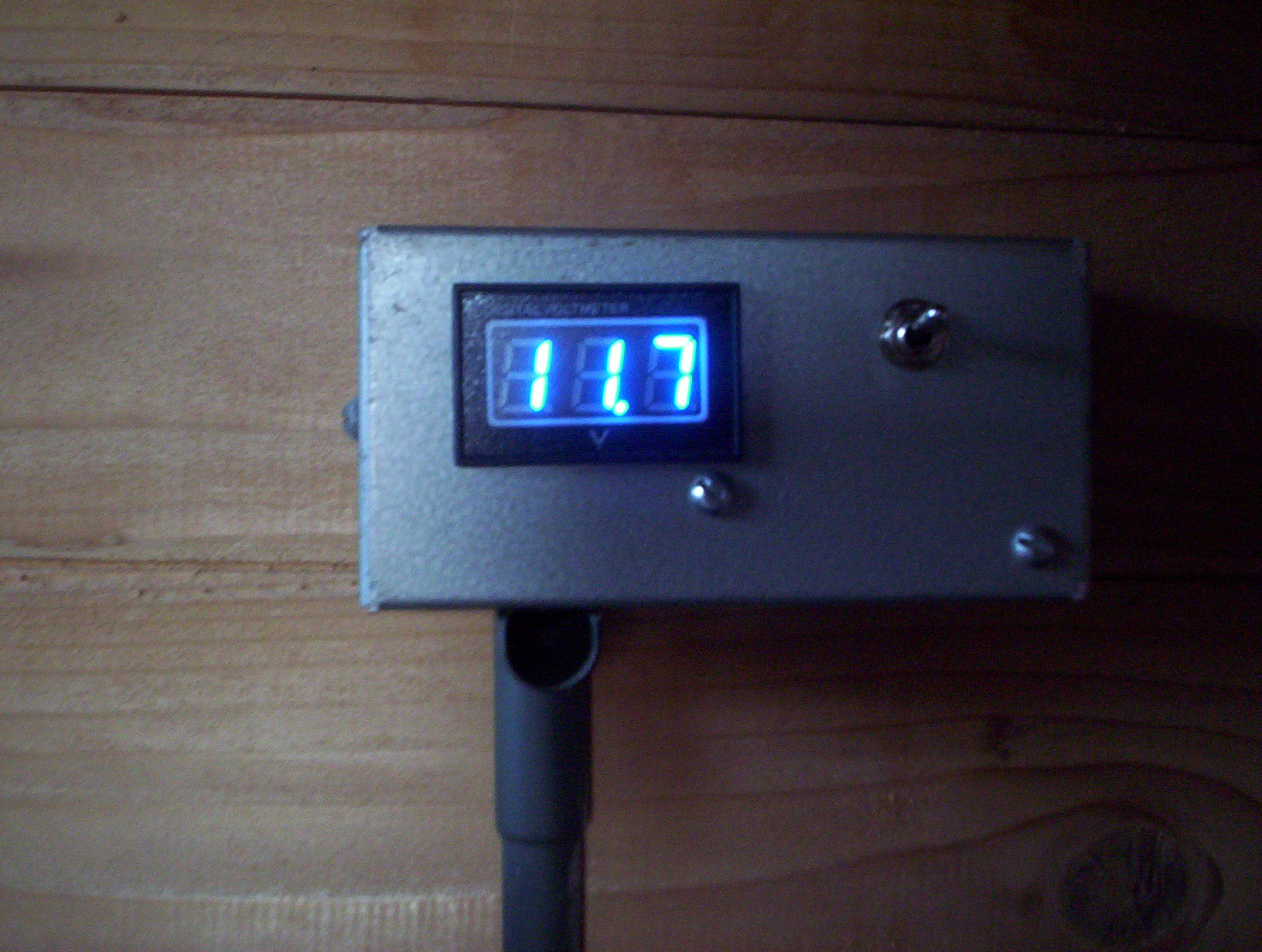 I say that as prelude to the fact that I was perfectly happy to make watching the Lair’s new indoor voltage readout the high point of the morning’s entertainment. At ten minutes to eight, the sun broke over the nearest ridge top. It wasn’t clear sun, there was a ribbon of thin cloud and a few junipers in the way. But I’d been waiting for it, and as soon as I saw it I reached up and flicked the switch on the new/old box that held the three LCD seven-segment displays.