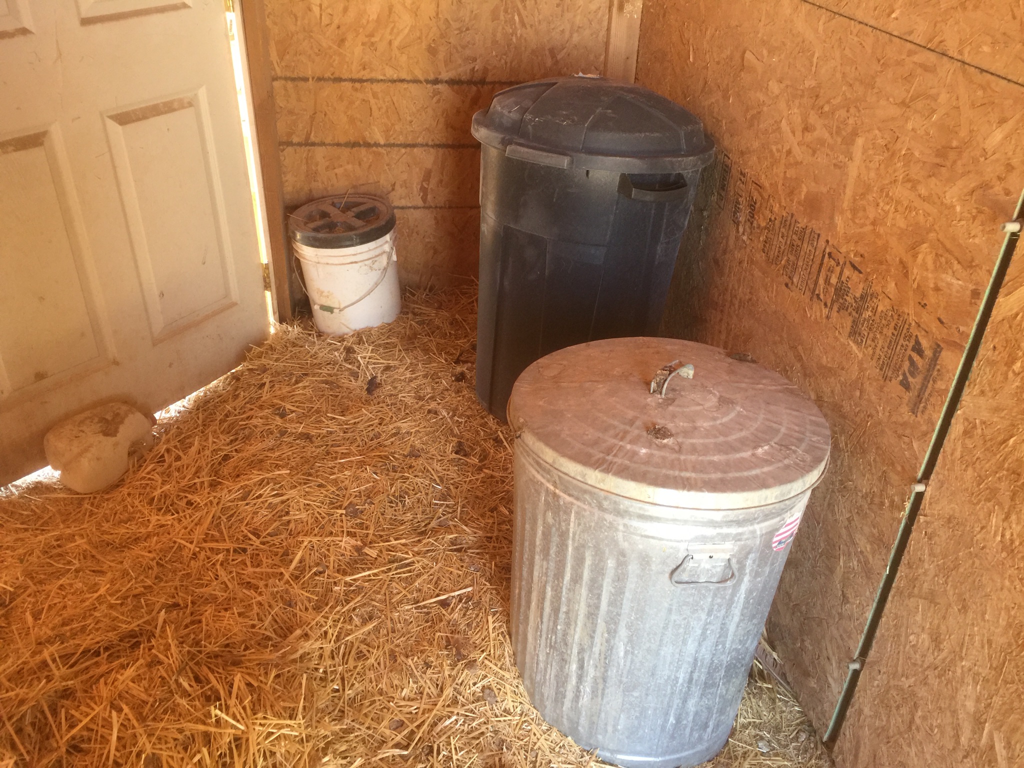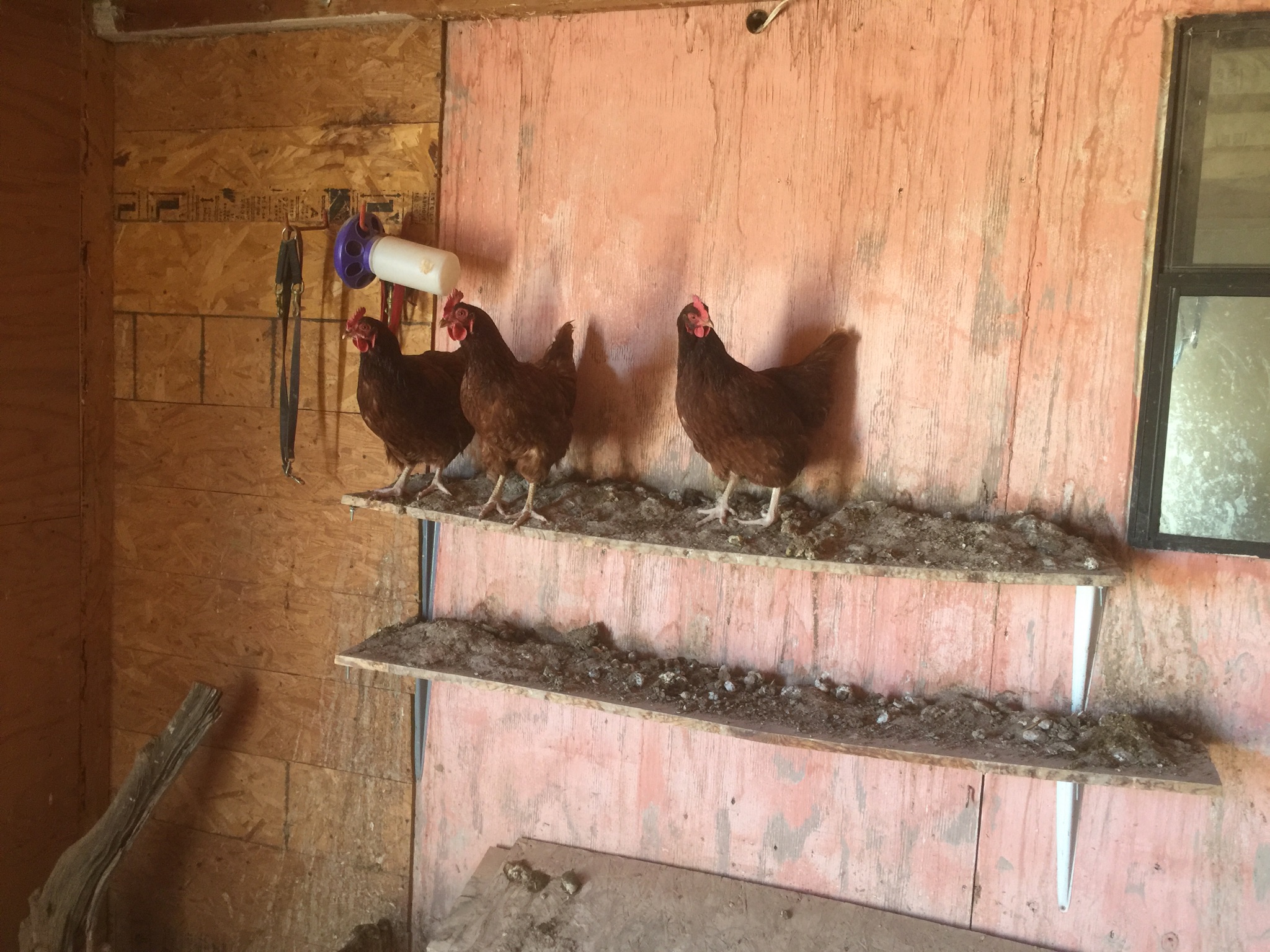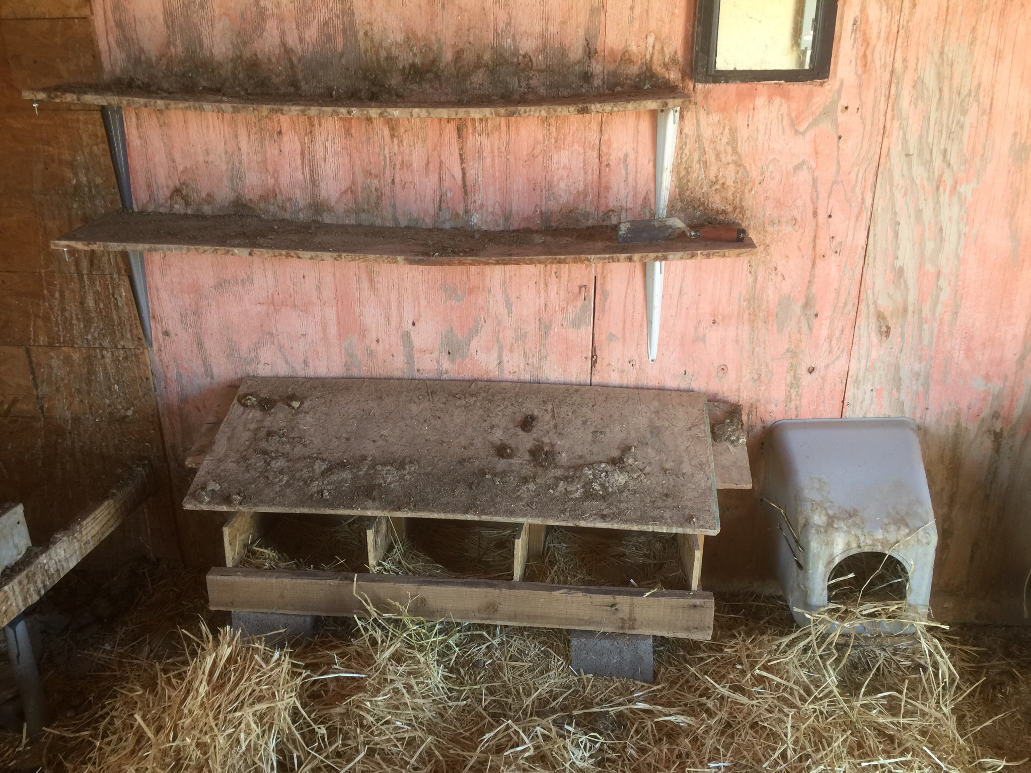 Since the flock is officially changing ownership, with Neighbor L taking over monthly subsidies and therefore management decisions from Landlady – I figured I’d better give the shelves their annual scrape. This batch of hens decided to roost up there, so they get six inches deep in shit pretty much moments after I clean them off. I put in the nesting box from the Fortress coop – it has two, but they only ever used one of them. And I set up a second feeder and waterer.