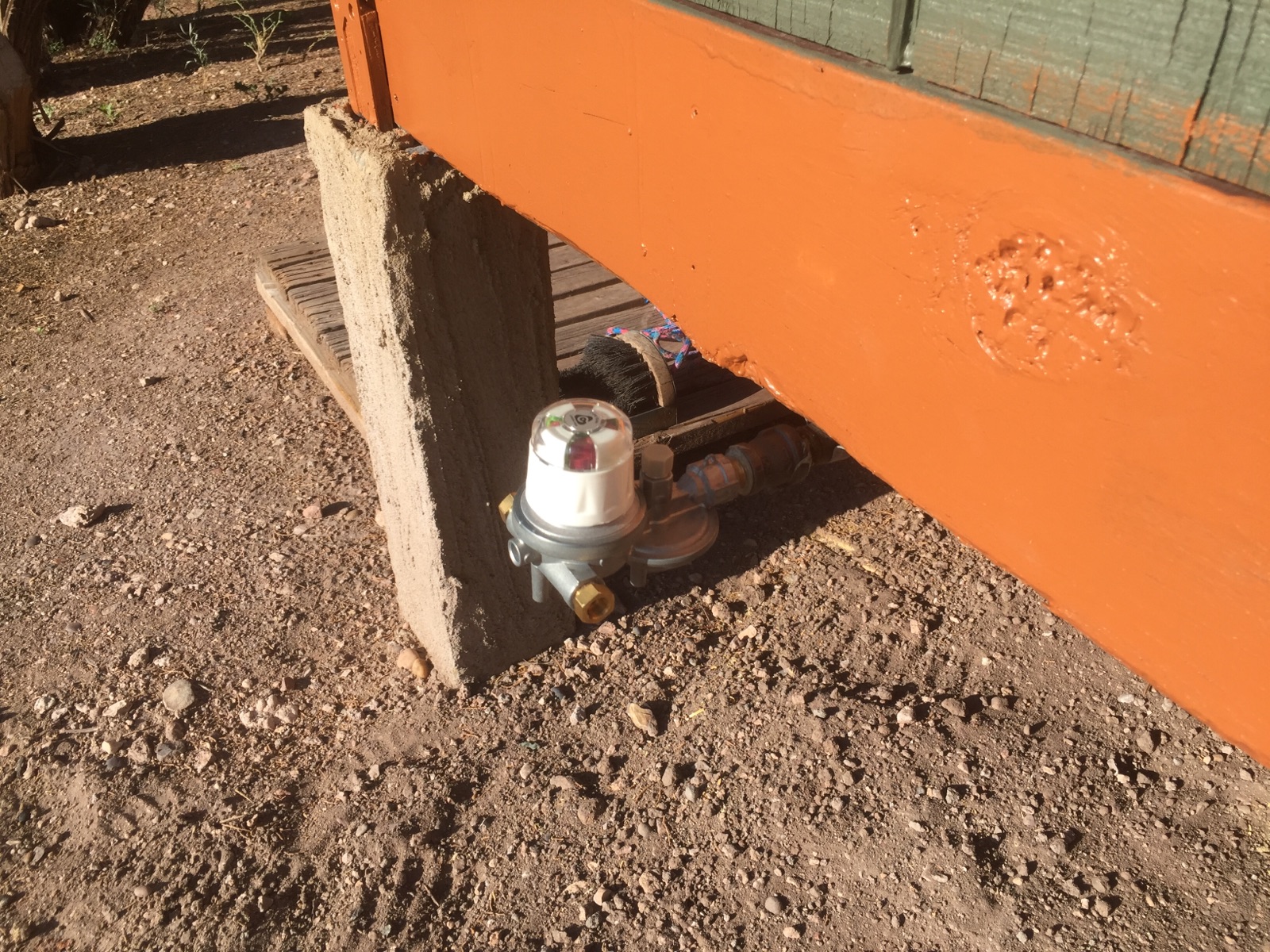 The diverter regulator is permanently fixed to the cabin now. I didn’t buy any concrete yesterday so I don’t have enough for a pad – I may actually go looking for some suitable shale like I did last year for the woodshed floor, just so I can call that part done. Or maybe I’ll wait and pour concrete; can’t decide. Either way it’ll be weeks before I have pigtails to connect the bottles to the regulator which of course doesn’t matter for numerous reasons, like how it’s currently late July and stifling. Thought it was kind of funny that I’d pick one of the hottest days so far this year to finish a winter prep.