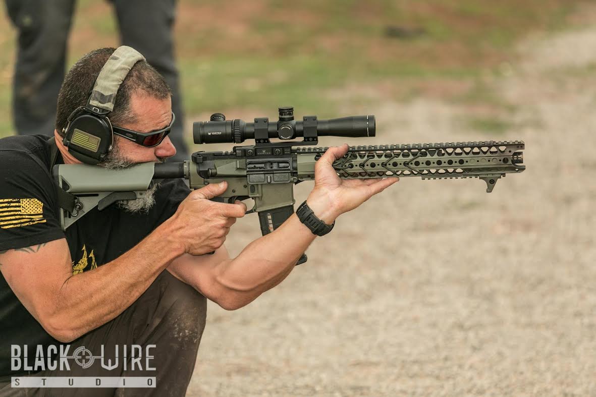 If you look closer, you’ll see that the top photo shows him using a non-magnified red-dot optic (looks like an Aimpoint T1), and using a stance/grip that allows a high degree of speed and control. It’s not a good stance if you want to shoot pretty groups at long distances, but it’s great for shooting multiple targets quickly when you’re relatively close to them. The hand far out on the rail gives you more leverage to start and stop the rifle, so it makes it easier and faster to transition.