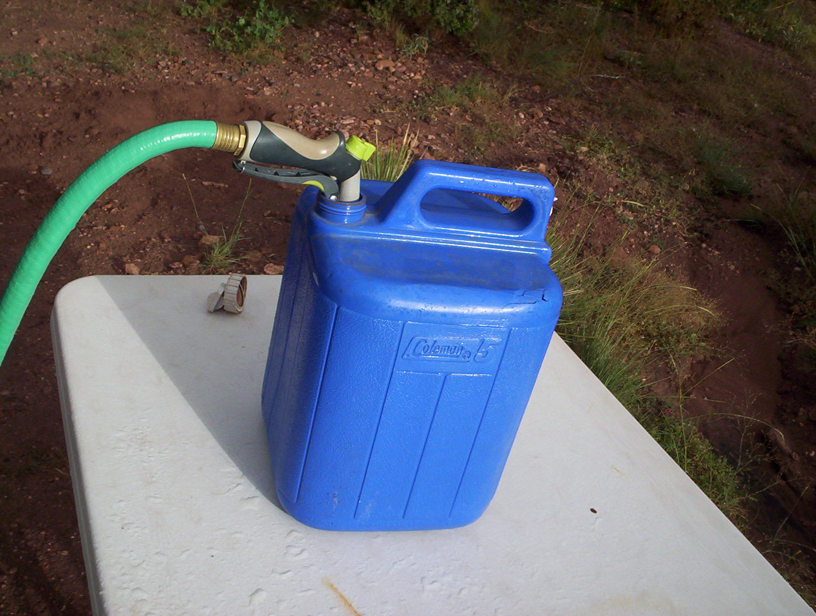 Or you need a barrel with a spigot with hose fitting and hose in the trailer, tied down of course, or a metal screw on lid can with a spout if you can quickly find either of those around you lying discarded in the desert or the barn. Most plastics are from China, are not UV stabilized even if they claim to be (experience talking) and get brittle after short exposure to sunlight and heat, are not long term use items. But you already know that. PS For future improvisations, if you have or can get the black or silver waterproof real duct tape, not a Chinese imitation, it’s more reliable and useful than the regular kind, will probably hold your brittle plastic. You know, if it will hold a cracked canoe together…with no leaks… Just saying…