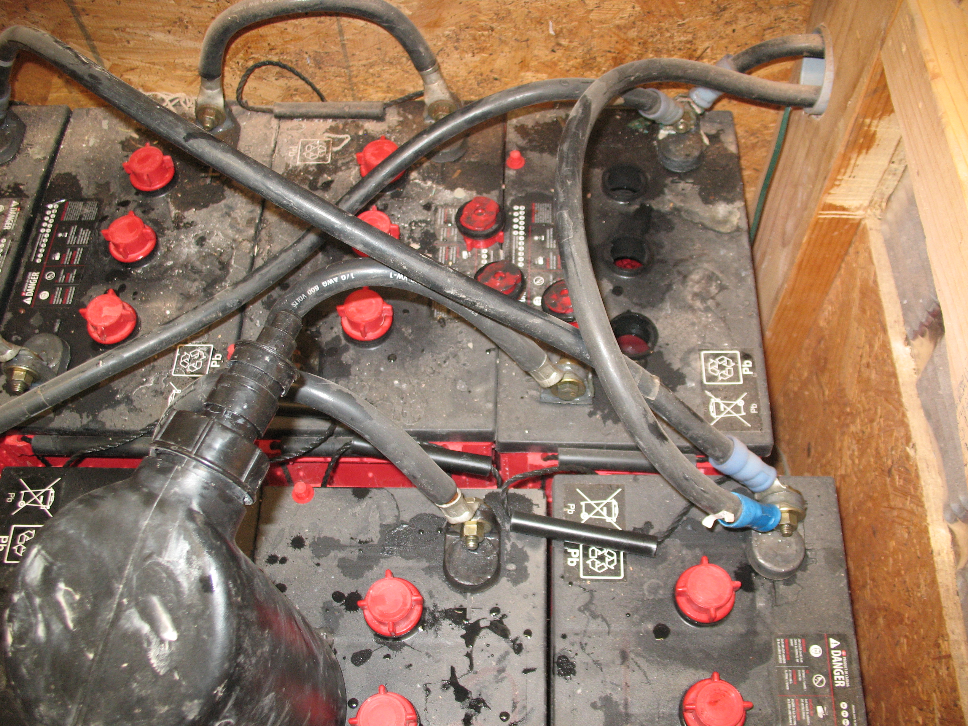 It’s the first of the month, which makes it Battery Day at the Gulch. I thought, since I’ve got this good camera now, I’d take a moment and express some of our community battery guy’s pet peeves. If you plan to set up an off-grid electrical system, you can save yourself hours of aggravation just by the way you lay out your storage batteries.