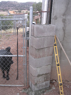 So on the new location of Gitmo Poco’s big gate there’s a space between the latching post and the wall. Couldn’t be helped: The space is X big, the gate is Y big, and the remainder comprises a hole in the fence. Not big enough to string more fence, just a little smaller than the width of a concrete block. So I figured, we’ve got blocks and we’ve got cement, and we’ve still got some rebar. How hard can it be?