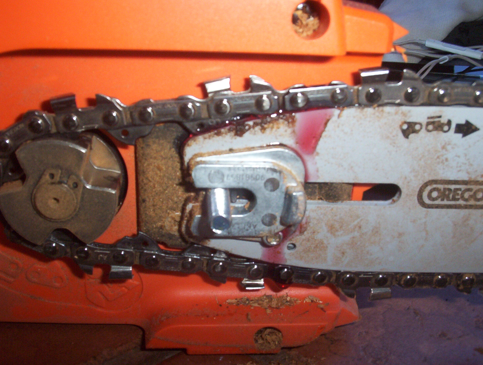 So I brought the saw inside and took the bar cover off, and worked the bulb on the manual oiler. And sure enough, it does leak a little oil onto the chain on command. So that’s good.