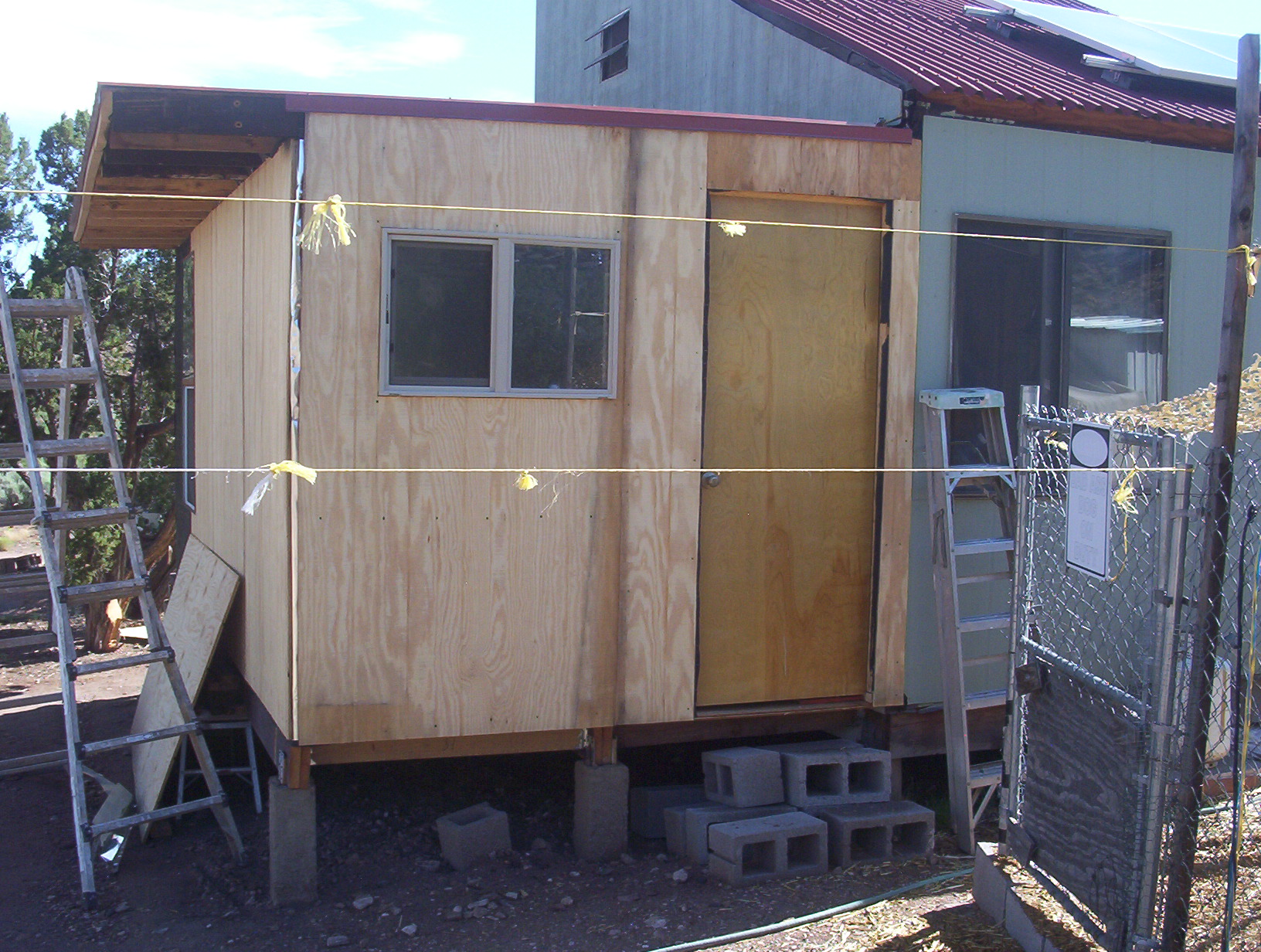 Mark, it’s difficult to judge space from a photo but it looks as if he can put a safe landing outside the door, then come down on the left (doorknob side) to another safe landing about where the addition ends, the straight parallel to the chicken pen down to the ground. If he needs more space for the gate swing he can come out farther past the addition before the final grade down. But remember all the discussion about the roof slope????? hahahahahaahhaa What do we know from a photo? I sure hope Joel will not do steps, Andrew, because steps, as you said, are not kind. Yes it means more work and more materials, but once done it will be safe and comfortable.