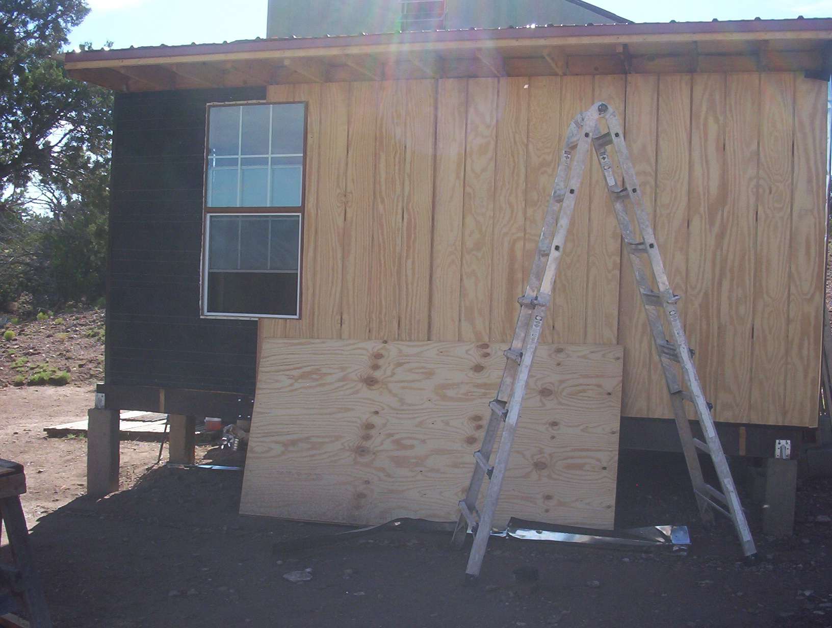 …but I got a wild hair to switch to the south wall to see if putting up the siding would make me less reluctant to pass behind my own cabin. Jury’s still out. I still don’t know what it was about that that raised the hair on my nonexistent ruff. But Claire’s right; I’ll need to do something to doll up that door. It’s a good solid-core door but in that setting there’s something about it that says “mean white trash.” And I do have some small bits of history with mean white trash. Maybe I’ll just paint it a whimsical color or something.