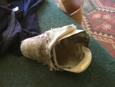Everything went great all the time we were working yesterday morning. Then, just as we were finishing the cleanup, I felt my leg’s socket get unacceptably loose and tell me the contact cement was letting go on that wedge that fell off a while ago.