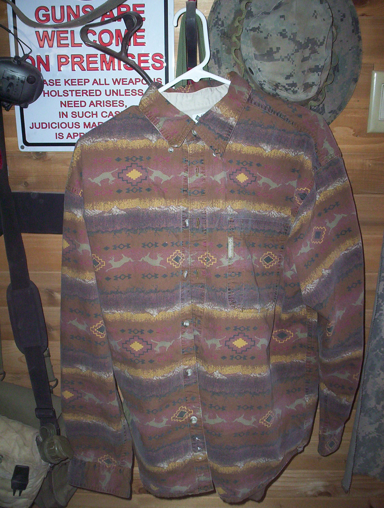 Ain’t it purty? Chamois cloth, which I love. Fits just right, roomy but not all floppy, y’know? Not new, but hardly worn at all: Just faded a bit from washing. Just right. I was over at a neighbor’s this morning on an unrelated matter when out of the blue he asked me if I wanted it. “It’s a little small on me,” he said, and given the difference in our sizes it probably was.