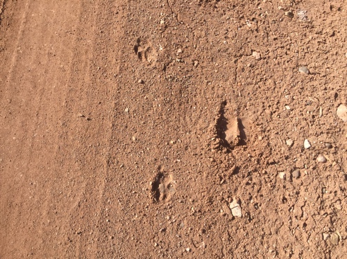 We definitely are sharing the place with cattle again, alas – and on the road next to new cattle prints I saw some really big canine ones…