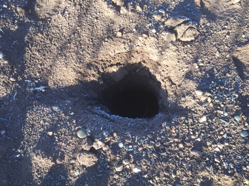 Big hole! My first thought, of course, was scavengers and that both bothered and perplexed me; it’s fairly recent, and there can’t be anything left more than six feet down to attract a scavenger. Then I took a closer look…