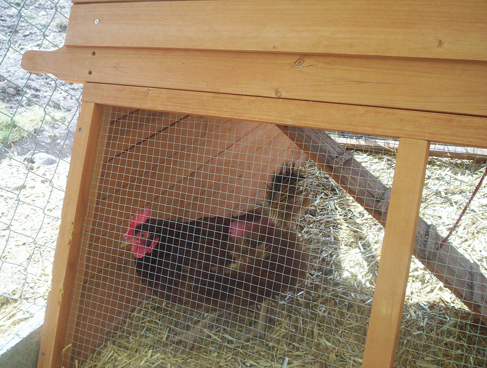 So I finally stuffed the four birds into the carrier and drove them back to the lair (sharing the back of the Jeep with Little Bear, which probably really settled their minds on what was coming next.) Having already put Selma in the little portable coop so she could not become a part of this no matter how she tried…
