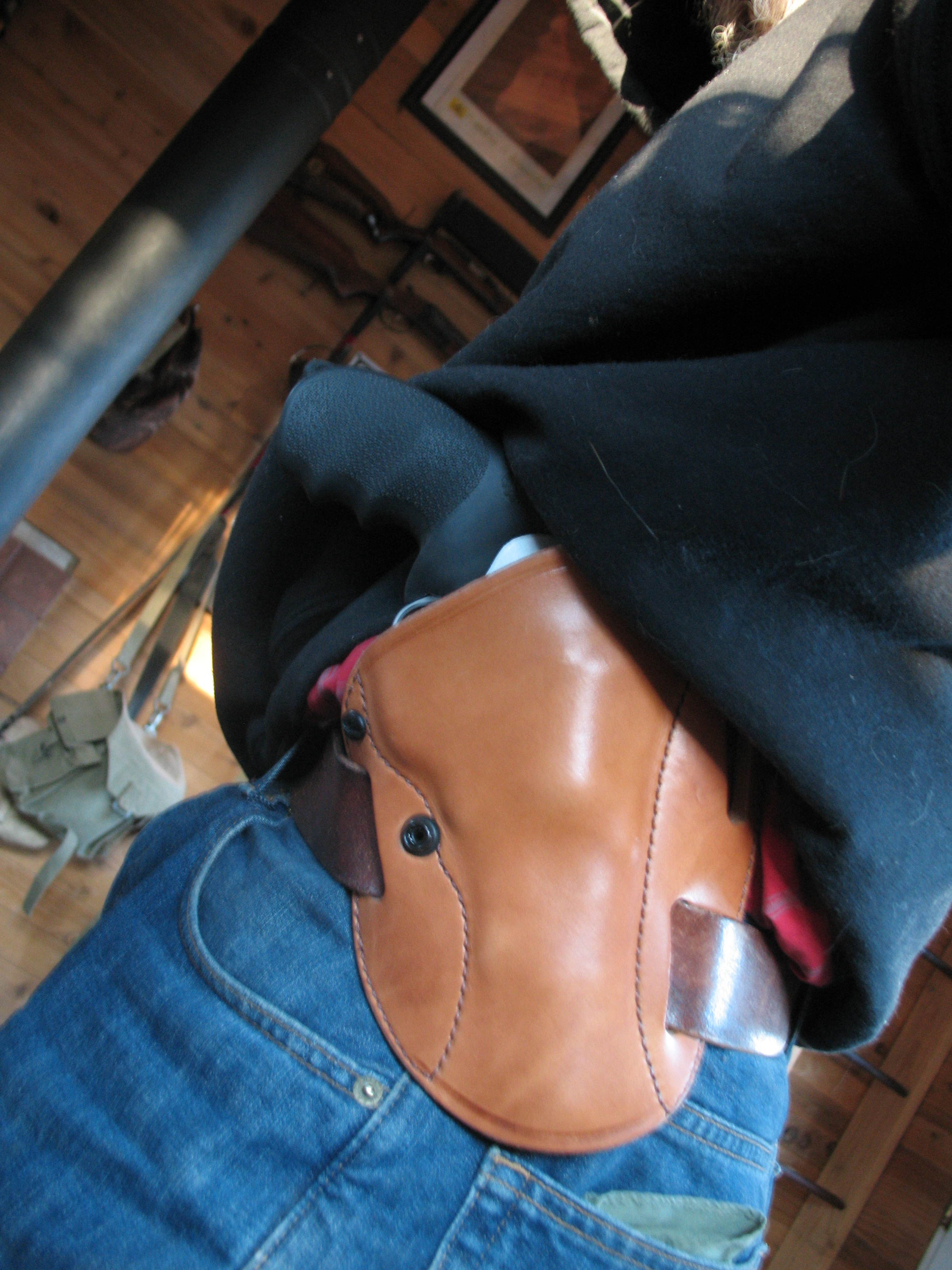 Most modern holsters aren’t made to work with a separate belt. They ride too high and the center of gravity’s all wrong. I thought this one might work because it rides so low, and in that sense it did. Unfortunately the holster itself is floppy junk and I couldn’t ever draw the gun one-handed. Again, back to looking like a dork, but now with more dysfunction. Really, the best solution I found to wearing the revolver with a winter coat was to use the crossdraw.