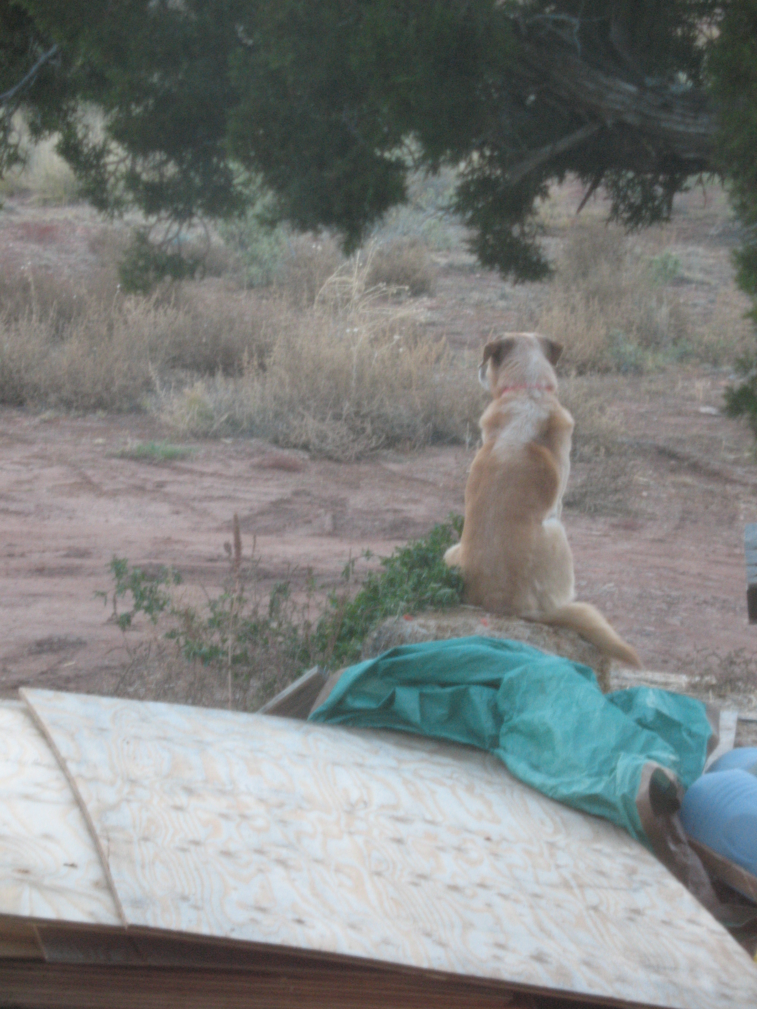 This morning, just as I was struggling down the loft ladder, they both lit up like the threat board in the CIC of a destroyer about to be squished by a battleship. Oh, they wanted out bad. I opened the door to release Ghost, while holding LB back for the all-important Tie-Out Cable Check, and he flew through the door silently – which is what happens when Ghost really, truly wants to chase something he really, truly sees. LB is normally more interested in some lovin’ than chasin’ first thing in the morning, but this time he was all business: Let me out that door! When I can hear LB but not Ghost, there really is something they consider important. It may not be anything I consider important, but whatever. They’re doing their job.