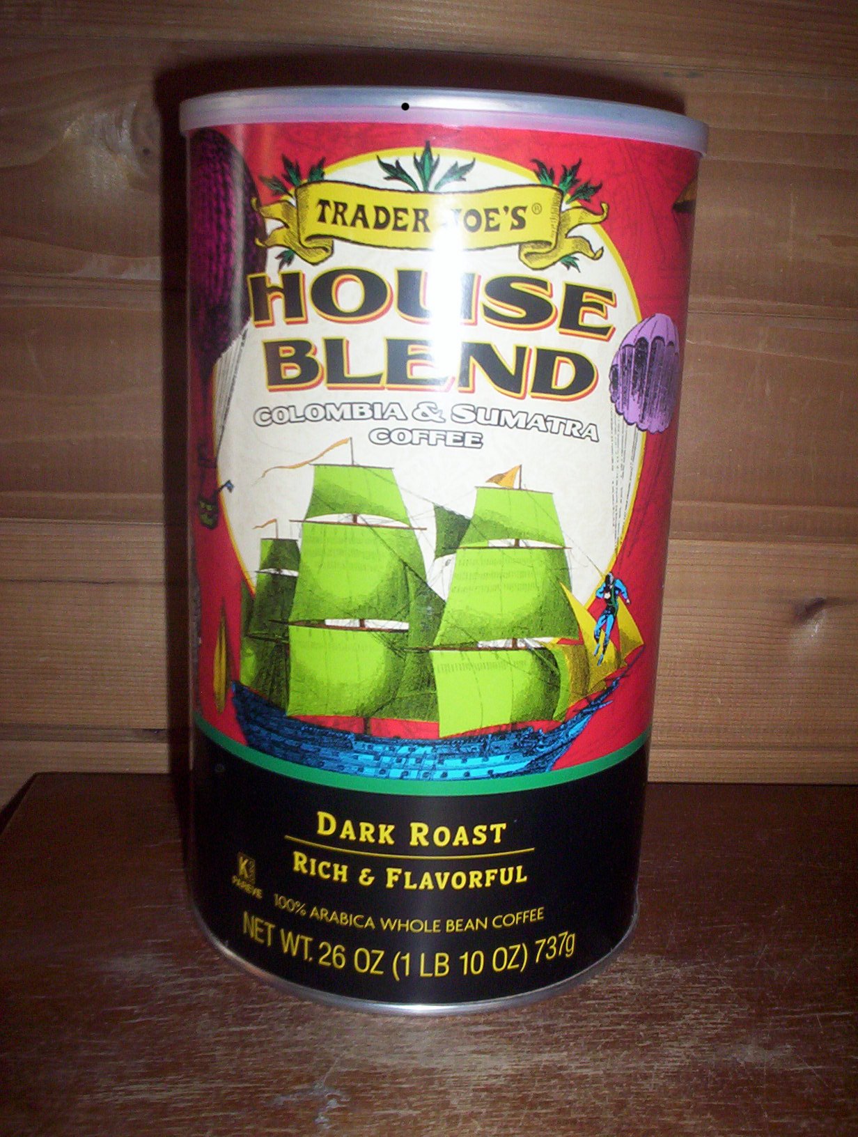 Landlady brought me a can yesterday, and so reminded me once again of the single complaint I have against this coffee. Technically I’d never run out, because the alternative is the pre-ground stuff they sell at the IGA and that’s almost-but-not-quite not worth drinking at all and so I’ve been rationing the Trader Joe’s. And I’ve done that before and noticed, even at the time, that a couple of weeks after opening the can the thrill is gone. It’s a very oily roast and really needs to be sealed. Comparing a can that’s been open for a month with one that you just pulled the tab on is like…well, it’s like comparing something that’s acceptable in a mediocre way with something that makes you want to be worthy.