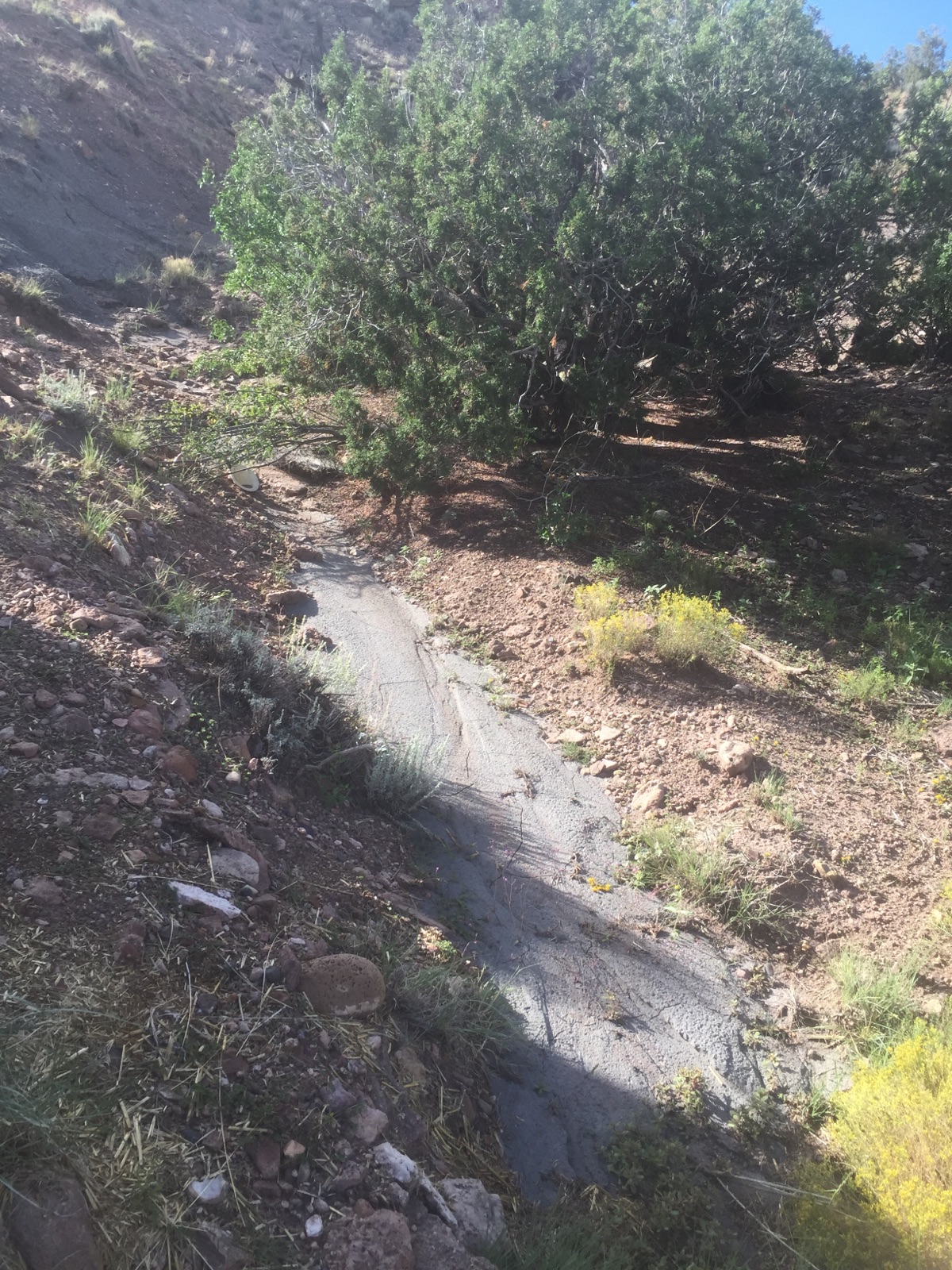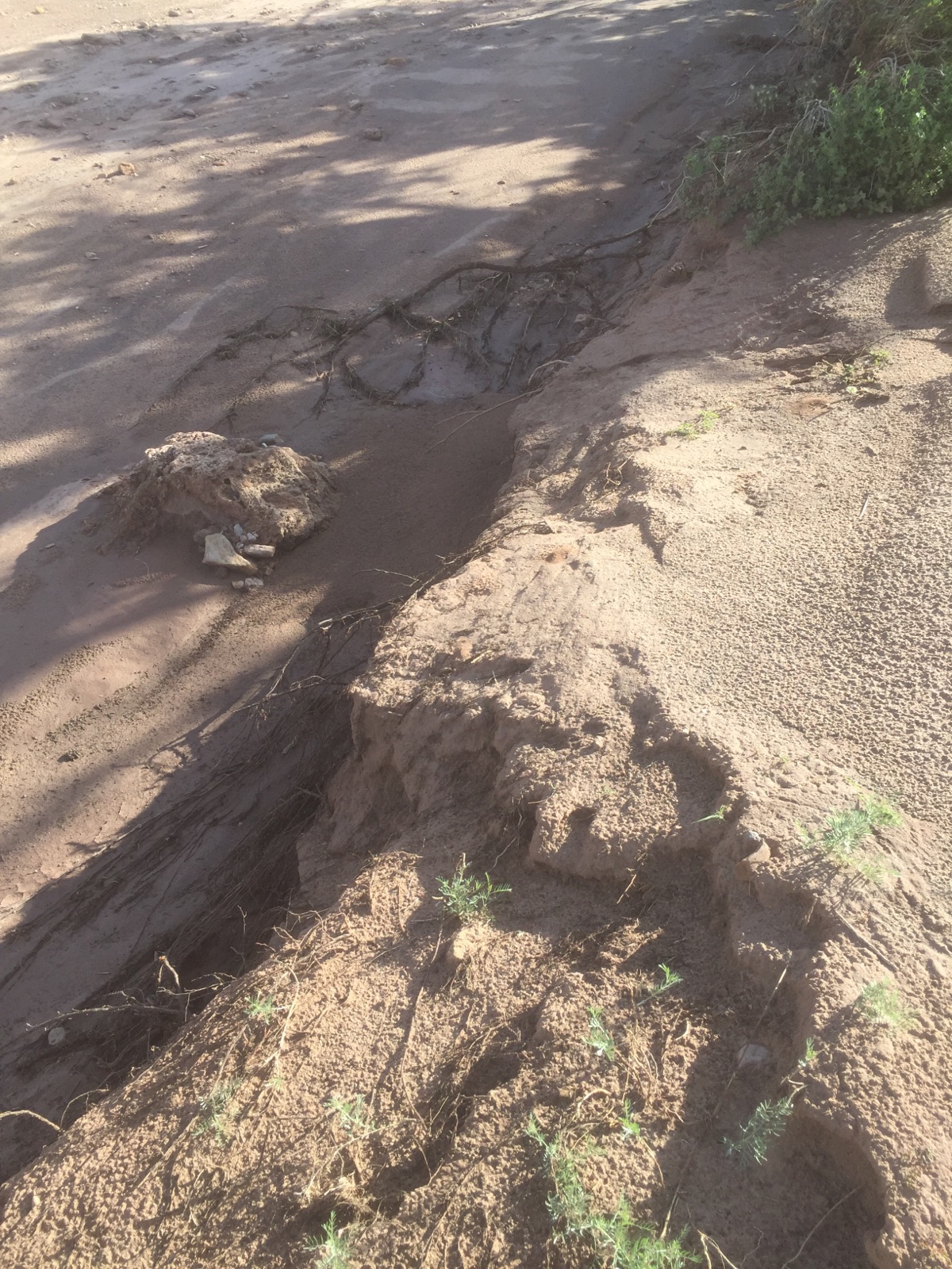 This is the end of my driveway, where it joins with the wash. Three weeks ago that just washed away, leaving me with a drop-off with a nice big rock at the bottom. Not taking the Jeep there.