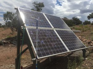 Yesterday and half of today I’ve watched the voltage readouts with increasing concern – I know the voltage on the batteries running the 12-volt system is low and I think I know why, but the overall voltage wasn’t setting the world on fire either and not because the batteries are failing. Granted that we don’t have 100% sun right now it should have been doing better than it was. On a hunch I went out and ran my hand over the ground-mount panels and it came away pretty dirty.