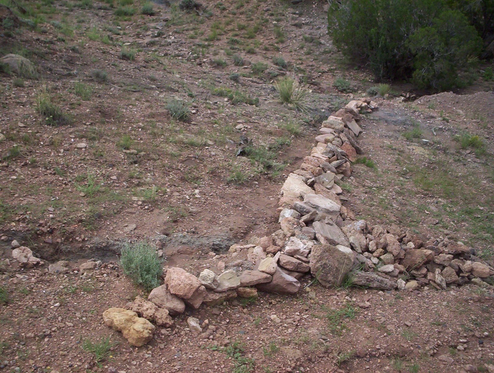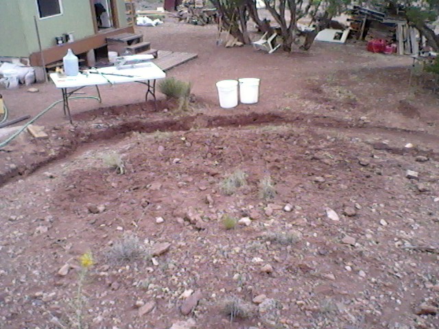 And two hours of prying rocks later, I’ve a lovely little watercourse that will last until it silts up. I use my 10-gallon laundry barrels to gush water through the trench and see where it needs tweaking. When the gully runs the trench needs to channel a lot of water for a brief time and you want it to keep moving freely. I go through this every year and it works just fine. By the end of Monsoon this trench will be all full of rocks and silt again, and I won’t have to trip over it all year – but I will need to dig it out again next summer.