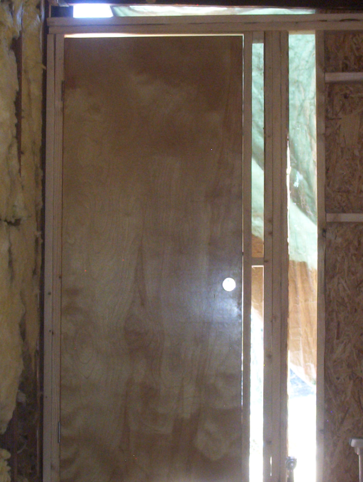 I ain’t no carpenter, but this bit actually came out fairly well. There was one tiny glitch which was totally not my fault for once – but once that was overcome the addition to the frame slid right in. Now I can sheath around the door. And Monday – or possibly tomorrow – I can get a doorknob, secure that opening, and I’ll be one step closer to opening the passage that officially transforms the Lair into a two-room cabin. 🙂