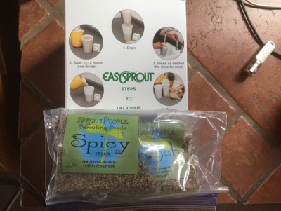 A sprouting kit! Along with an assortment of small packs of different sorts of seeds, and an offer to supply a larger bag of whichever suits my taste once I’ve tried them! And as if that’s not enough, a large cash donation toward the cost of my new prosthetic leg! And just at a time when an additional expense came to my door and I wondered if I’d be able to do the leg and give the Jeep what it’ll need this year. Eases my mind considerably, and thank you all very much!