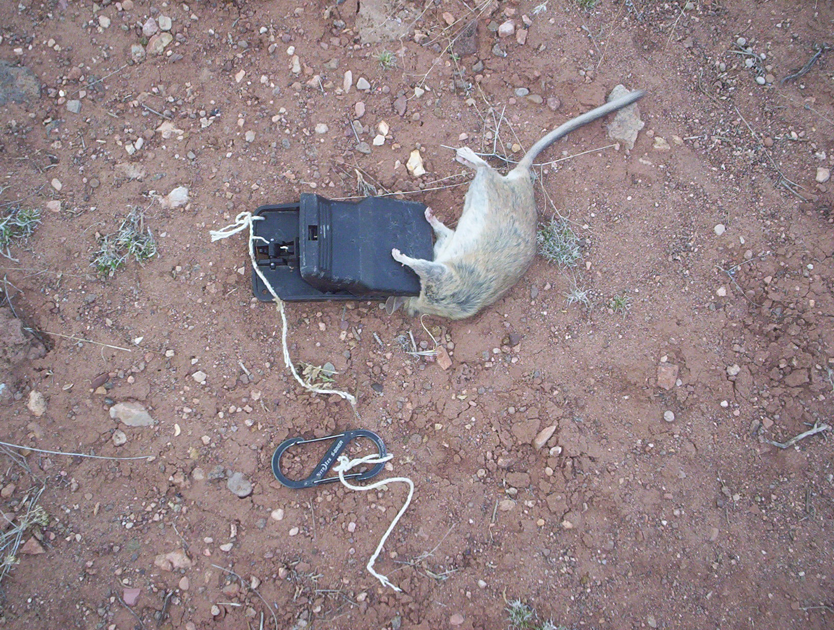 It is, of course, a very quiet dry enclosed space unvisited by humans for weeks at a time. So it is, of course, infested with packrats. I mean really disgustingly infested. I began plotting jihad recently when somebody started pissing on my loading gear, but to actually carry out the campaign would mean withdrawing protection from the Jeep and the Lair’s environs. I only have three traps at present.