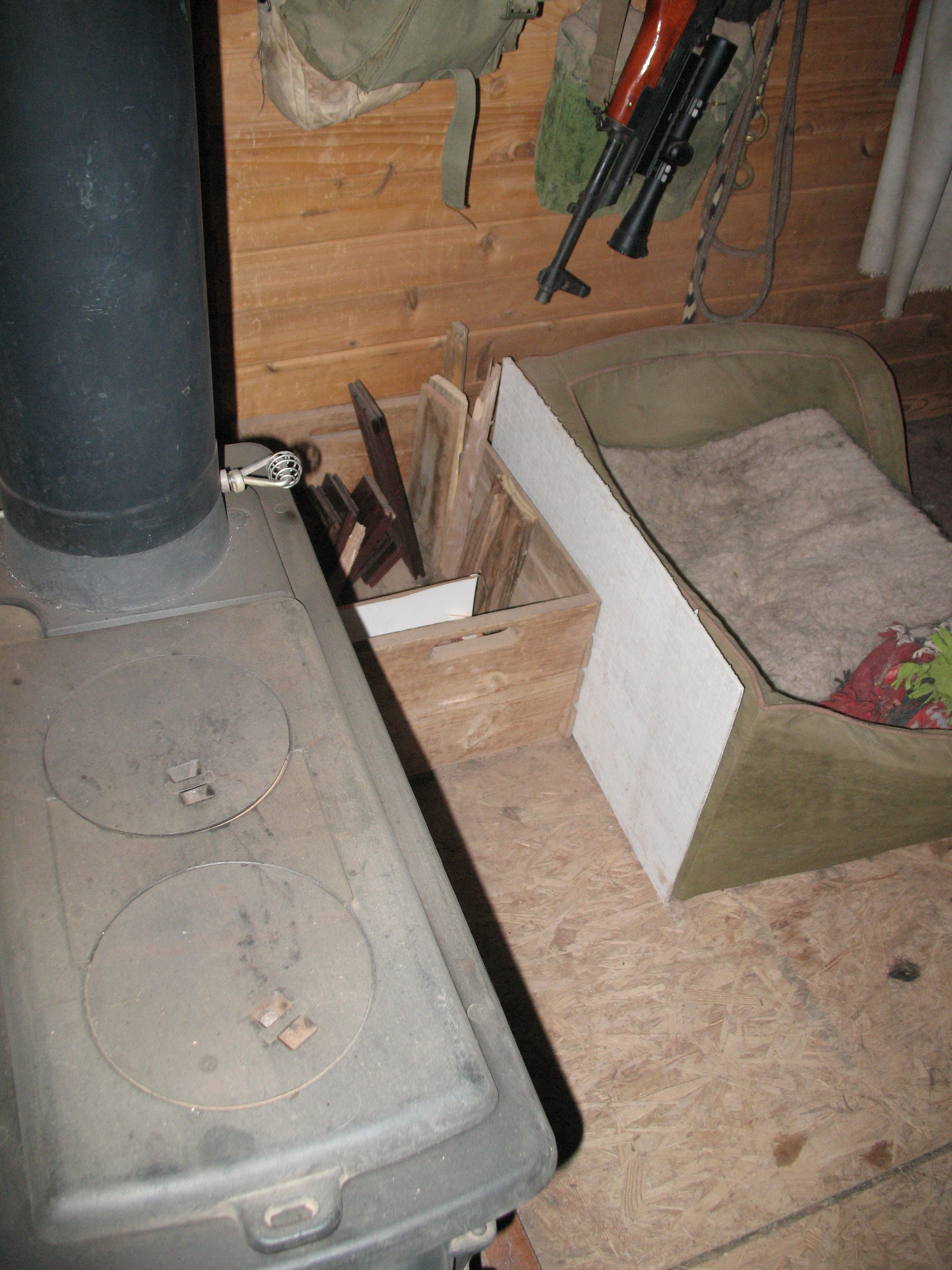 And of course every improvement points out the need for another improvement. Burning a bunch of hardwood pallet slats in the woodstove, the stove comes up to higher heat faster than in previous years. Too much of this will drive me right out of the 200 sq. ft. Lair, plus the vicinity of the stove can become an uncomfortable place to put flammable materials – like Ghost’s bed…