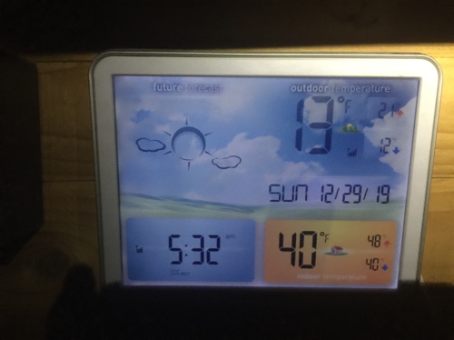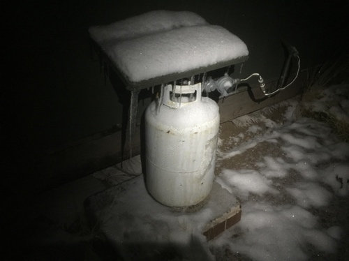 Yesterday it snowed and snowed – and the snow couldn’t decide if it wanted to melt or freeze solid. Overnight it made up its mind, so it wasn’t so much replace the propane bottle as chip out the propane bottle and then replace it. Ditto the wrench, which was buried under all the ice on the shelf above the bottle (which was one of my better ideas, BTW.) And get it done before your fingers freeze. Then you can go in and make your coffee. After you remember to re-light the oven pilot.