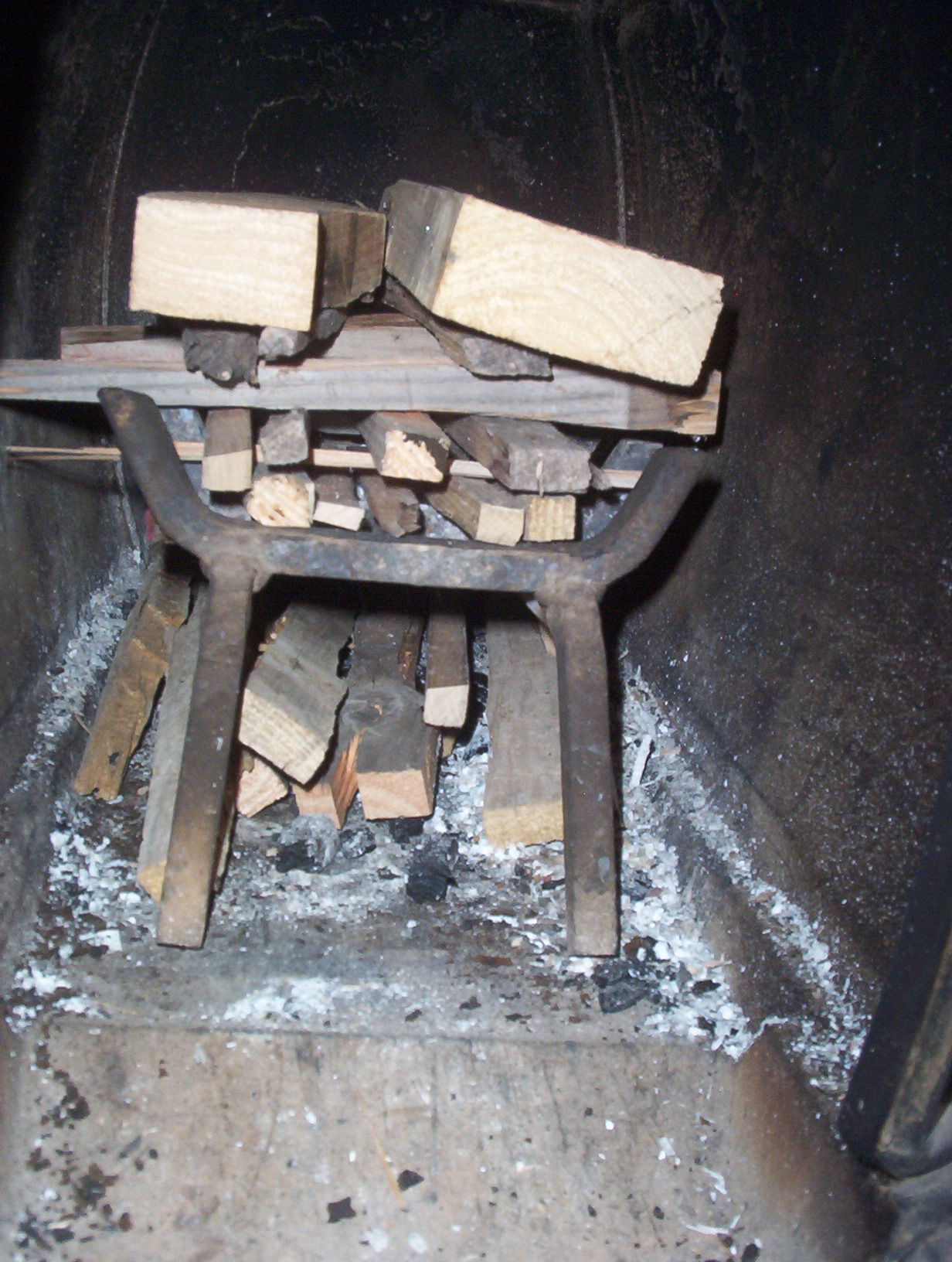 So away with all the elaborate tinder preparations. I just lay a fire starter across the grate with the match coating sticking out so I can get at it with a kitchen match. Then I stack split pallet boards on it, drop a few more on the stove floor, and lay a couple of 2X4s on top. Most evenings I don’t burn the fire so I can have all this set up ready when I come shivering down from the loft in the morning. One match, 100% successful fire start.