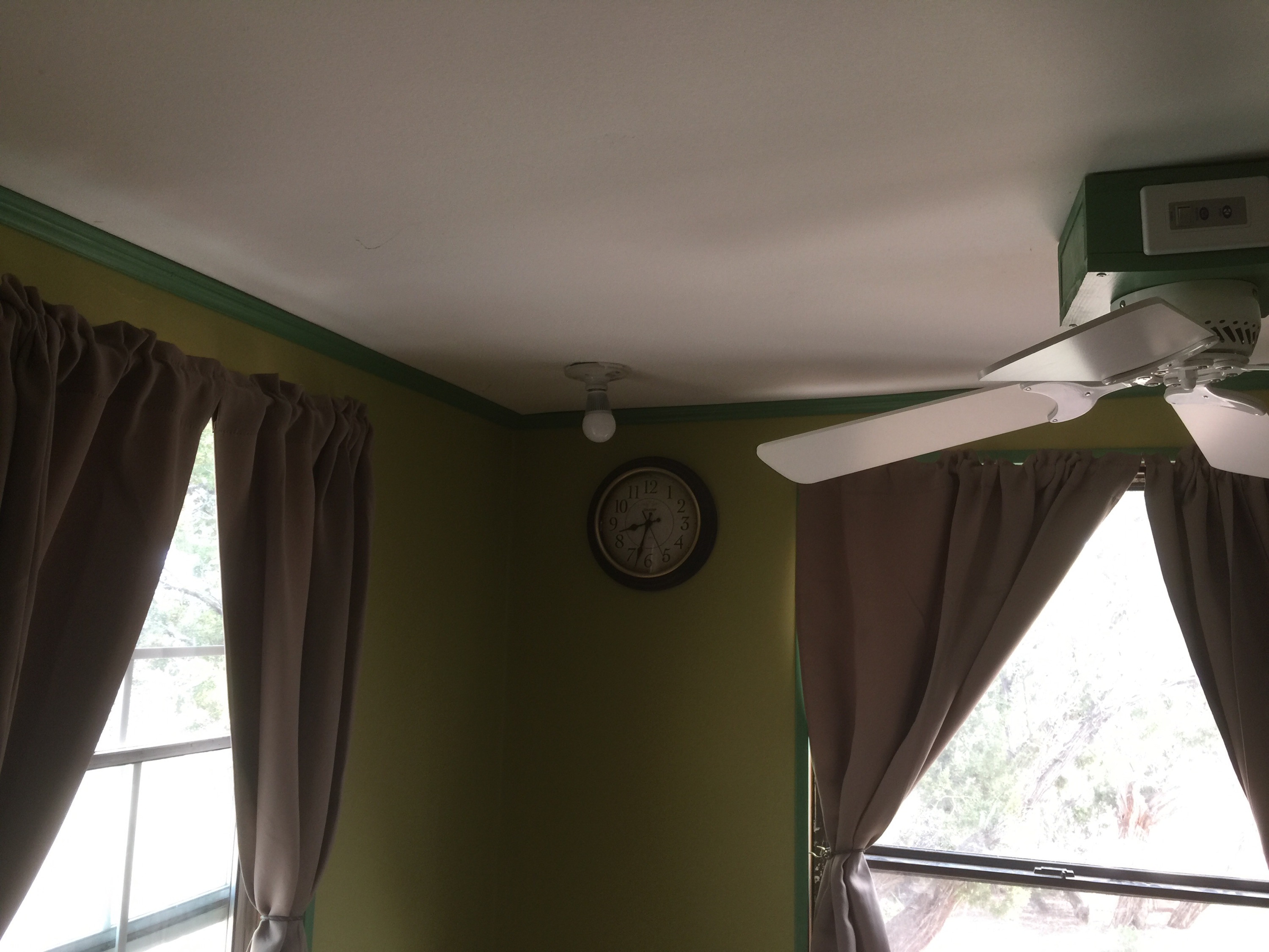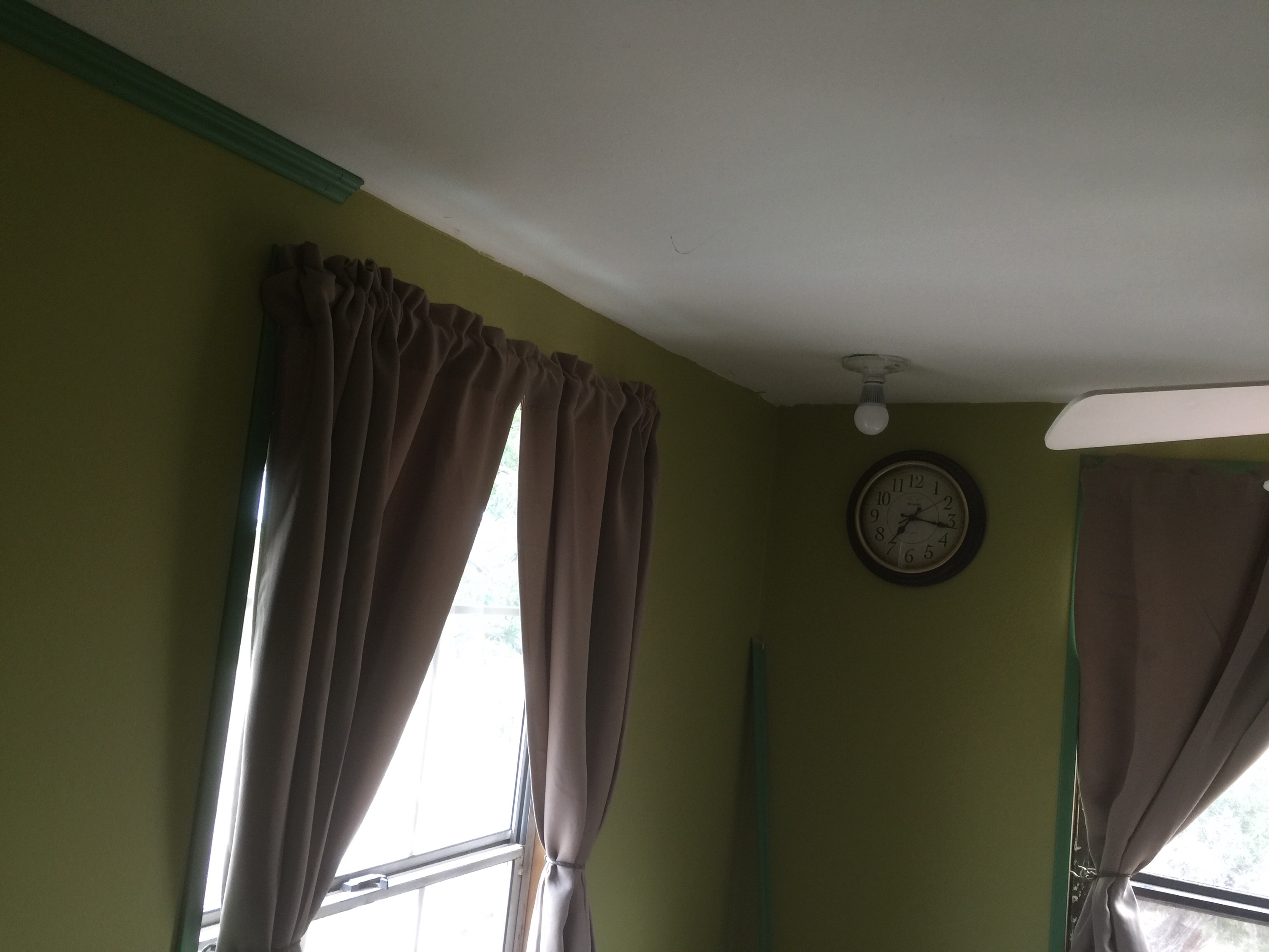 So yesterday we got a lot done but couldn’t reach completion because neither of us knew how to miter an inside corner on crown molding. If I’d just bought a bunch of baseboard and used that at the ceiling we wouldn’t be having this problem.