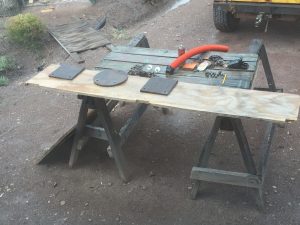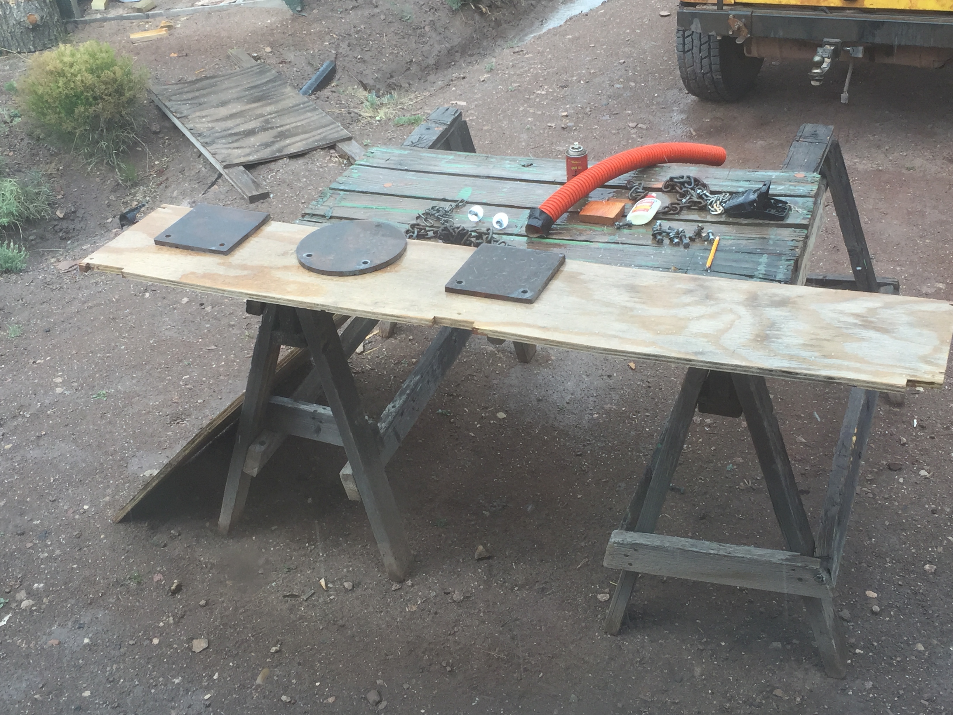The sun came out! Very briefly. I jumped up from where I’d spent most of the morning sitting and hooked up Torso Boy for a walkie. Then I started laying out metallic targets to determine how long to cut their new chains…