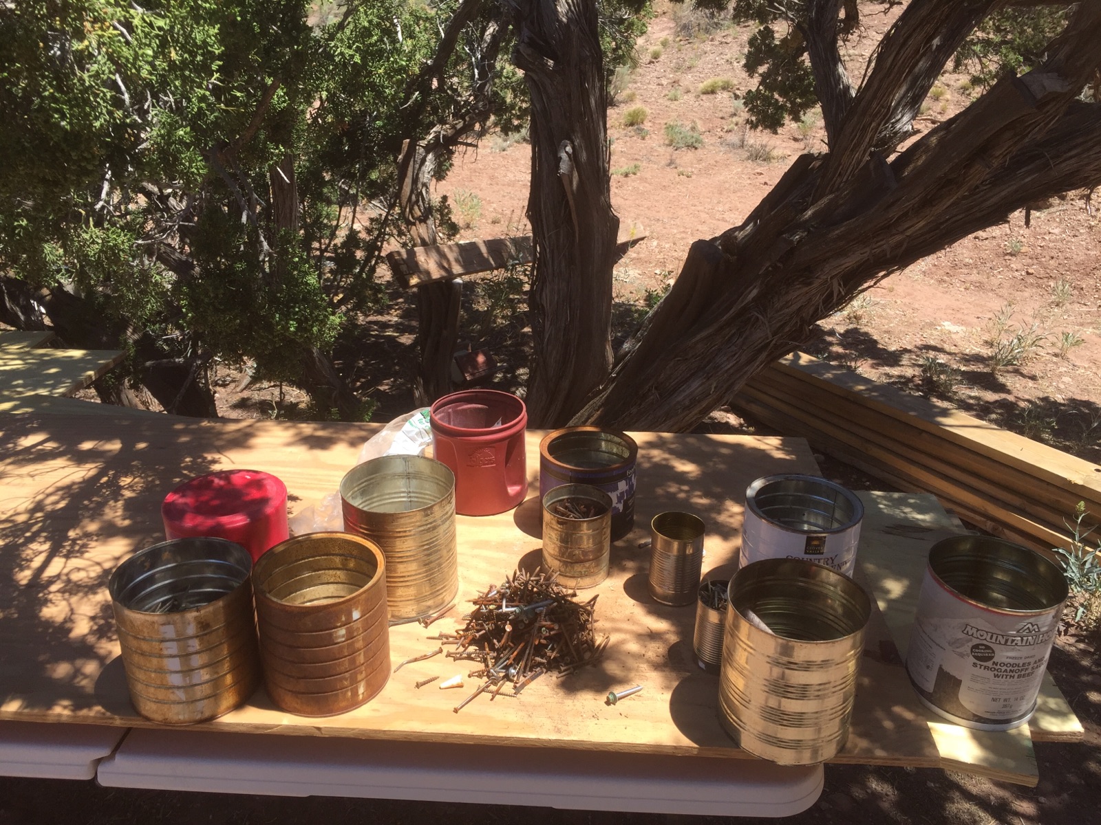And it was a mess. I pulled a lot of nails and unscrewed a lot of screws last year, some got re-used and some did not, and they all got tossed into cans willy-nilly, the junk taking up space with the useful. If I’d found a can hiding eight or ten 3/8″ bolts of the perfect length with nuts and washers that would have let me finish the paper target stand, I might have cried. Fortunately or unfortunately that did not happen.