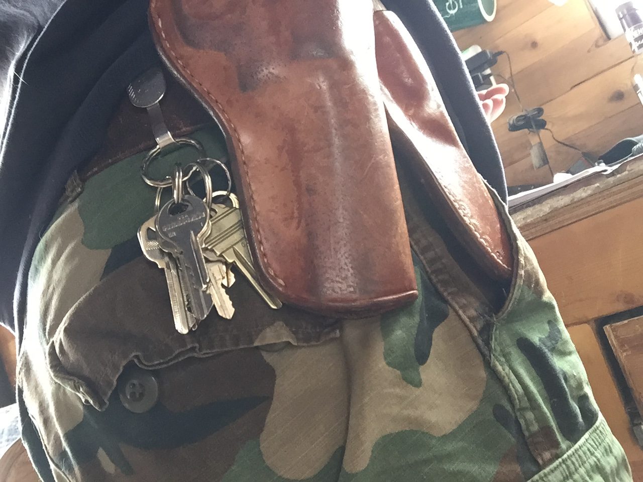 I’m too much a creature of habit. I always load that side of the belt gun/knife/keys. But last night I stepped out just for a moment to grab a loaf of bread. Put the keys on my belt without bothering with the other stuff, because I just grabbed my rifle. Then never put the keys back with the holster and sheath. This morning I slid the holster on my belt, then the sheath, then freaked out because I couldn’t find the key ring.