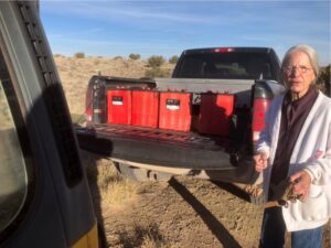 Those batteries, plus a junk battery somebody had dumped on the property that I took this opportunity to dispose of properly, had to be transferred from my Jeep to Neighbor L’s ludicrously high Dodge truck. This eventually resulted in her parking a little lower on a slope than the jeep, tailgate-to-tailgate, so I could slide the L16s on a plank between the vehicles while she held the plank in place to prevent – or at least warn of – disaster.