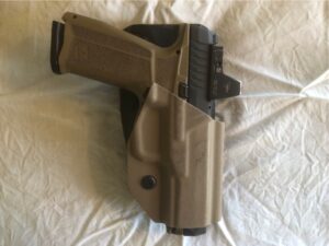 I got confused about Delta M versus Delta L, so I ended up immediately introducing my new no-name holster to Mr. Dremel, but that happily didn’t cause any issues. The holster fit the gun, it was comfortable, I could wear it under a shirt in town, and I hated it. I hated it because the old man with the bad shoulders had a terrible time drawing and reholstering with it. Especially reholstering. But it was never intended as anything but a stopgap so I didn’t worry about it. I replaced it with a much better one, which was not at all cheap.