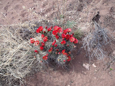 These are kinda cool, though. The little cacti, the only ones we have around here, usually only produce one or two blossoms each but some of them are going crazy this spring. Maybe it’s the sudden weather change – we had a couple extra months of winter, then just went straight to summer. Not really knowing, I’m gonna go ahead and guess that that’s the reason for the red-flower explosion.