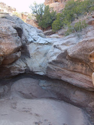 Fritz found a nice melt hole further on, though. Rock holds a little water better than sand does, duh.
