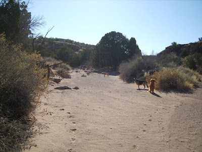 But overnight the wind blew itself out and the clouds blew away, and the day dawned unbelievably gorgeous. Magnus and Ghost are feeling better, and it was clearly no morning for hanging around the lair. So off we went to the Short Canyon.